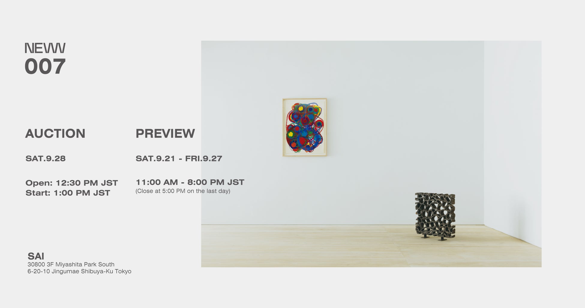 NEW AUCTIONが第7回目アートオークション「NEW 007」を2024年9月28日(土)にミヤシタパーク(渋谷)のSAIで開催