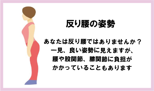 反り腰の多くの方は腰椎が動きにくくなり、股関節や膝関節に負荷がかかっていることが多いのです。また、おなかまわりに脂肪もつきやすくなります。