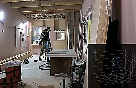 現場作業中における危険行動の予測・疲労の推定を行うため、動画撮影データより骨格データを用いた人物の行動認識手法を研究し、基本的な動作(歩行・起立・転倒・物を置く等)60種類をモデル化しデータセットとして活用できるようにした。実用化にあたっては、作業員の周りには多くの遮蔽物があり、骨格データの欠損により動作モデルとの突合精度が悪化することが課題となった。そのため、遮蔽に対する補完手法の研究を実施し、動き生成技術を用いた骨格データ補完による動作認識手法の有用性を検証した。右図は大工の作業を対象とした実証実験の現場事例である。右足遮蔽部分を3Dで骨格テータを補完したもので、動作判定により危険行動認識された場合に管理者にアラートを通知するシステムの構築を目指している。
