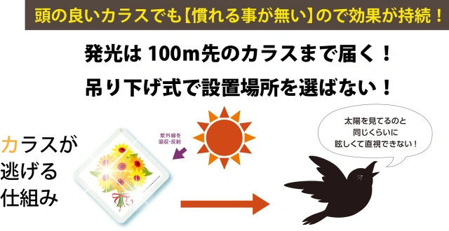 ヒトデから抽出した特殊なエキスを印刷時に塗布したカラスシールドは、紫外線の反射で強烈に発光。人には見えませんがカラスにはとても眩しく見えるため、恐怖を覚えその周辺に近寄れなくなります。カラスは非常に賢いため、多くの対策グッズでは一度は寄り付かなくなっても「慣れ」により効果が無くなることが多くあります。本製品の発光により慣れることはなく、使用環境によりますが半年~1年間は効果が持続します。