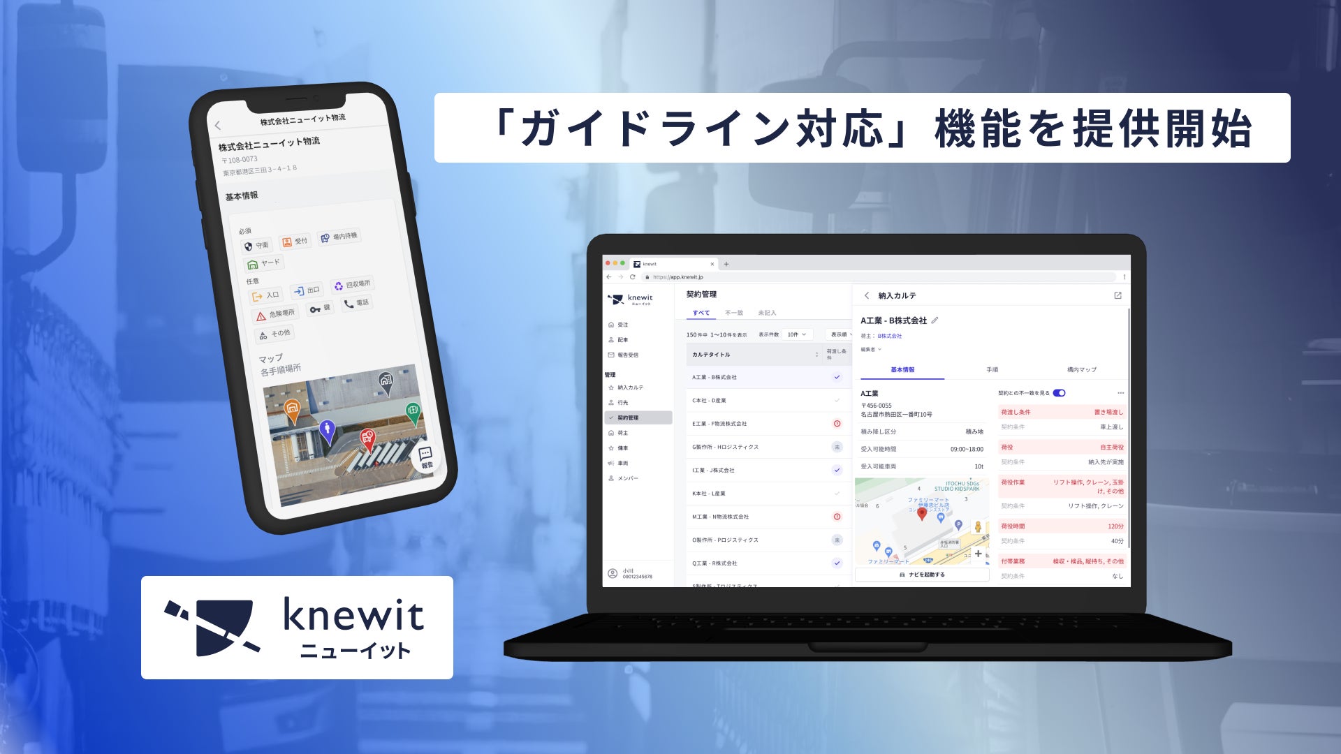 サプライチェーン管理SaaS「ニューイット」を開発・提供する株式会社knewit (以下knewit)は、2024年2月13日に政府から改正が発表された流通業務総合効率化法(旧:物流総合効率化法)と貨物自動車運送事業法(以下、物流関連2法)に対応可能な「ガイドライン対応」機能(以下、本機能)の提供を開始します。