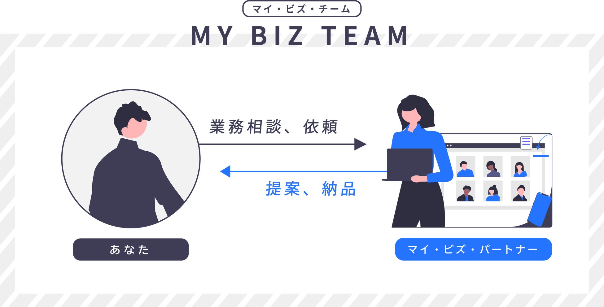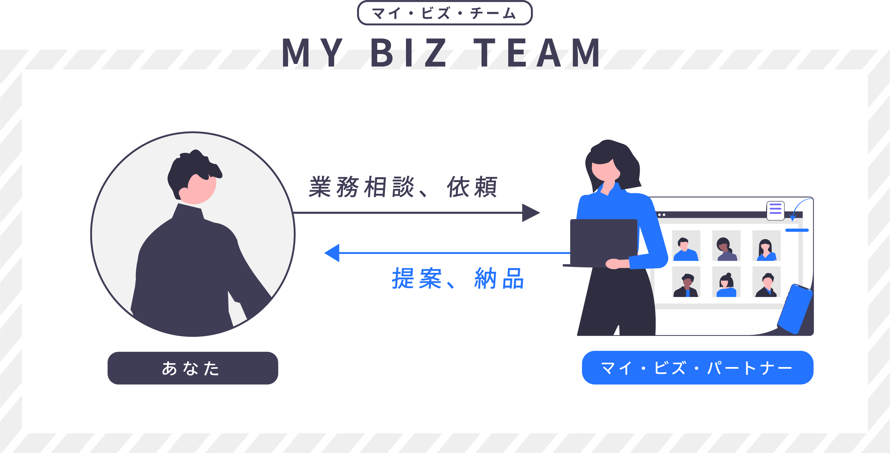 マイ・バック・オフィス(My Back Office)は、一人経営者が、組織を持たなくても自分のバックオフィスが持て、採用・育成しなくても自分専属のチーム「マイ・ビズ・チーム」が持てるサービスです。