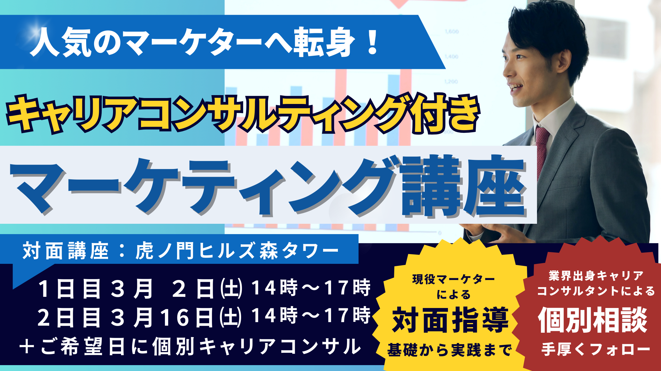 憧れのマーケターへ転職目指しませんか!日本初*「キャリアコンサルティング付きマーケティング講座」を開講。少人数の対面式で異業種からのキャリアチェンジも手厚くサポート!