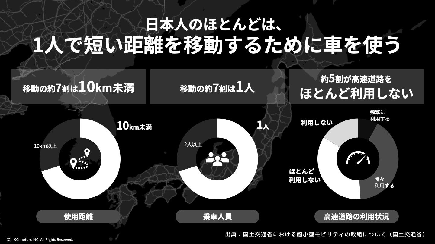 国内での自動車利用の実態を見ると、7割が1人での移動で、7割が10km以下の短距離移動であることがわかります。これは、現在の車の最小単位である軽自動車でもオーバースペックです。オーバースペックな車両で移動することは、ユーザーには不要なコスト負担をかけ、社会には環境負荷を与えています。