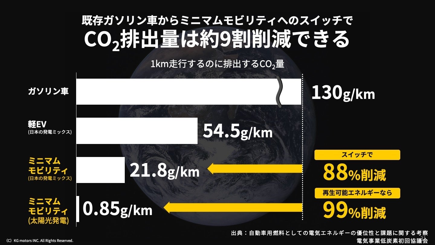 社会は必要最適減の物で豊かに暮らすミニマリズムの思想が注目されて、価値観の変化が起きています。移動においても、価値観の転換が必要です。KGモーターズは、1人乗りで短距離に特化したモビリティで「移動の最適化」という価値観を提案します。