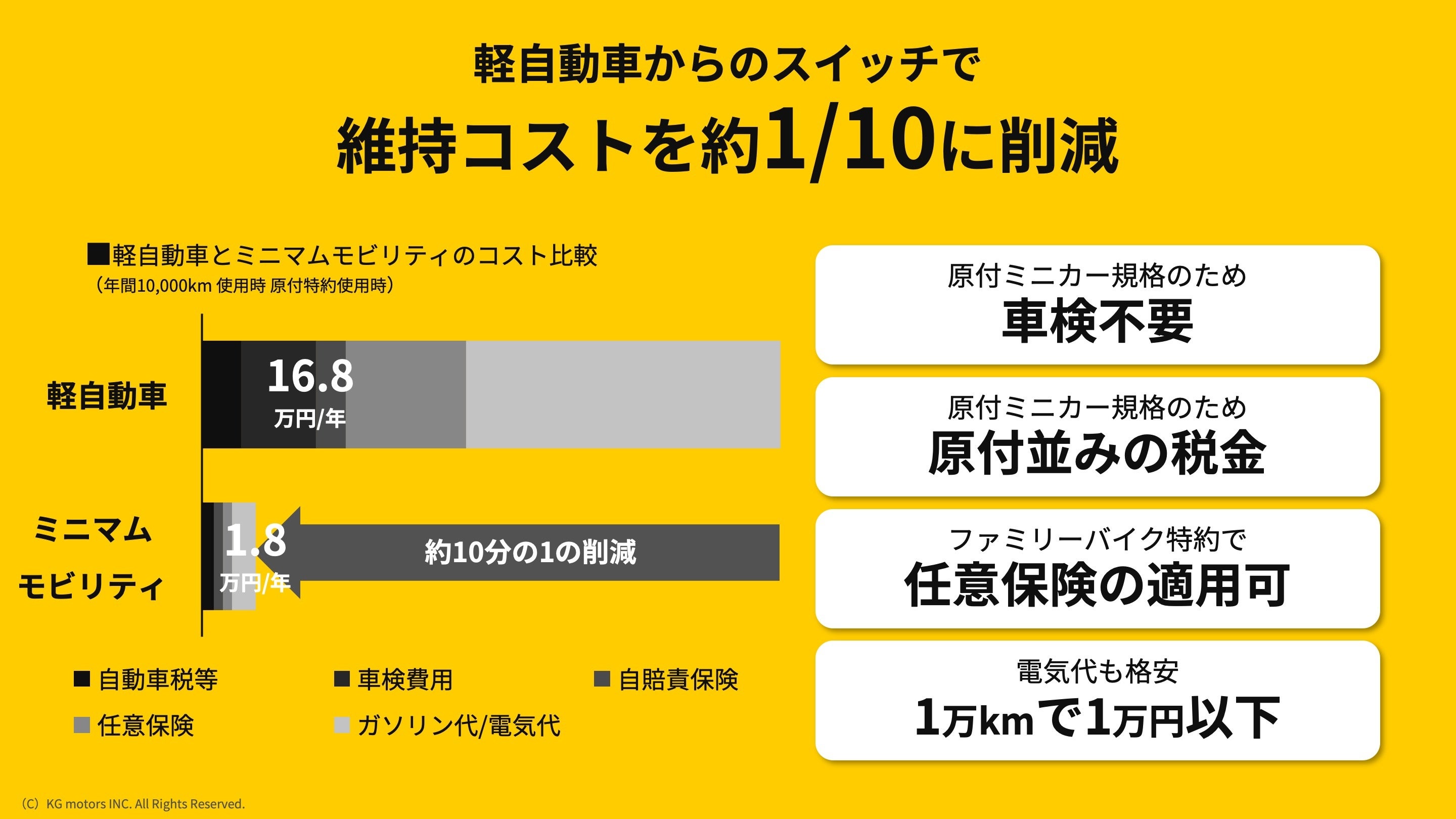 KGモーターズは快適性とワクワクを追求し、ユーザーの期待に応える「乗っていておもしろい」超小型モビリティを実現します。「乗りたい!」が先で、結果として環境負荷やコストを減らすことにつながる。社会も個人も未来に期待が持てるようになる。これこそが「今日より明日がよくなる未来を創る」手段だと考えております。