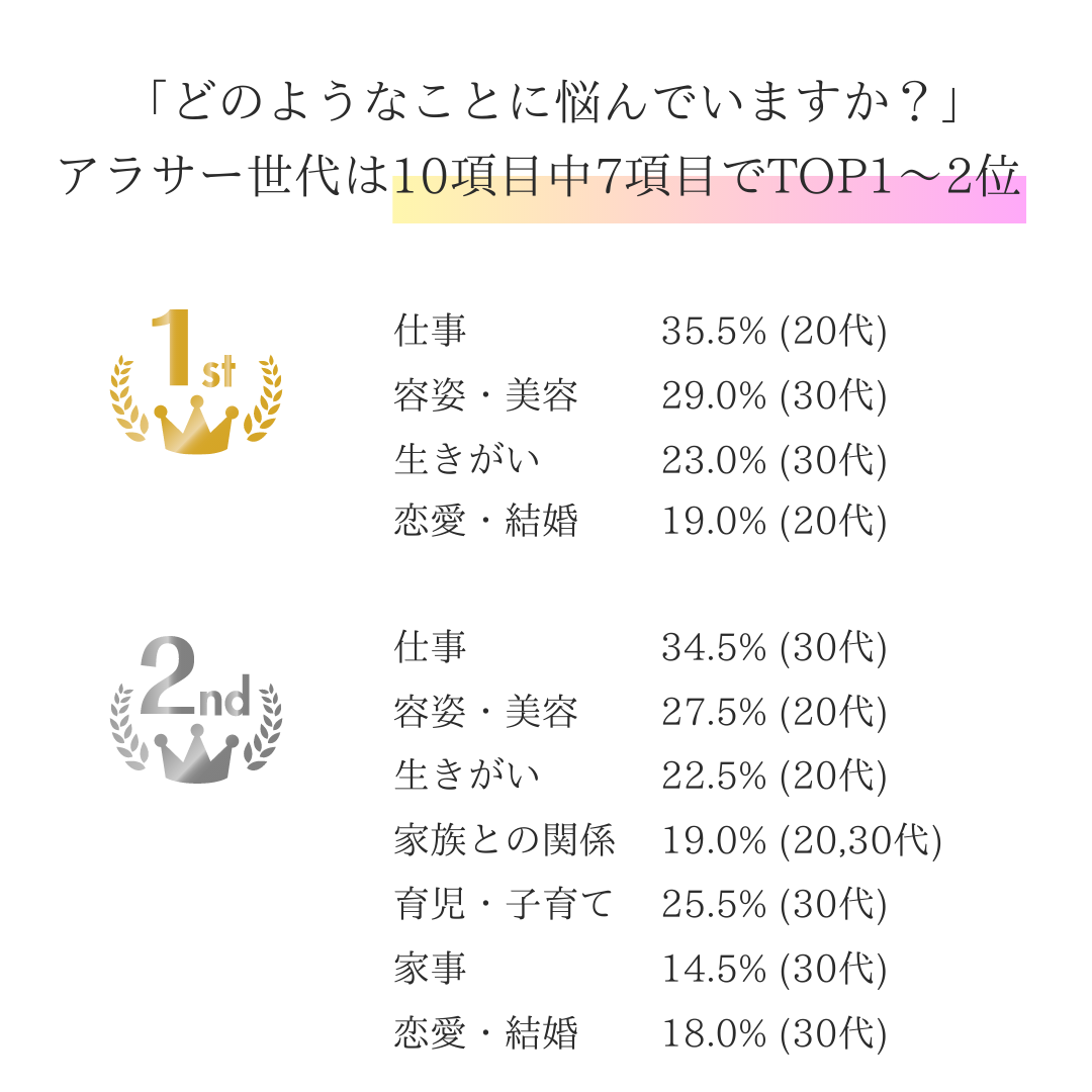 実際に「どのようなことに悩んでいるか」を世代別に見た際に、10項目中7項目でアラサー世代がTOP1~2にランクインしています。(仕事・容姿美容・生きがい・家族との関係・育児子育て・家事・恋愛/結婚 |養命酒調べ)
