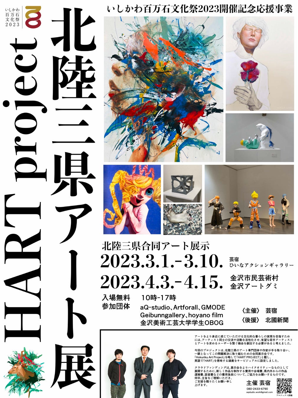 aQ-studio(代表:永井拓人、所在地:名古屋市東区)は、北陸3県のアート関連団体とともに、若手アーティストの支援を目的とした合同企画展示会「HART PROJECT 2023」を石川県内の4会場で実施。2023年4月3日より第二期が開始します。4月15日まで。