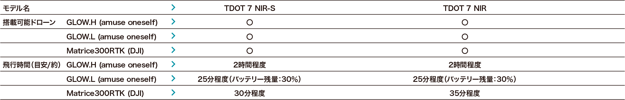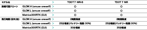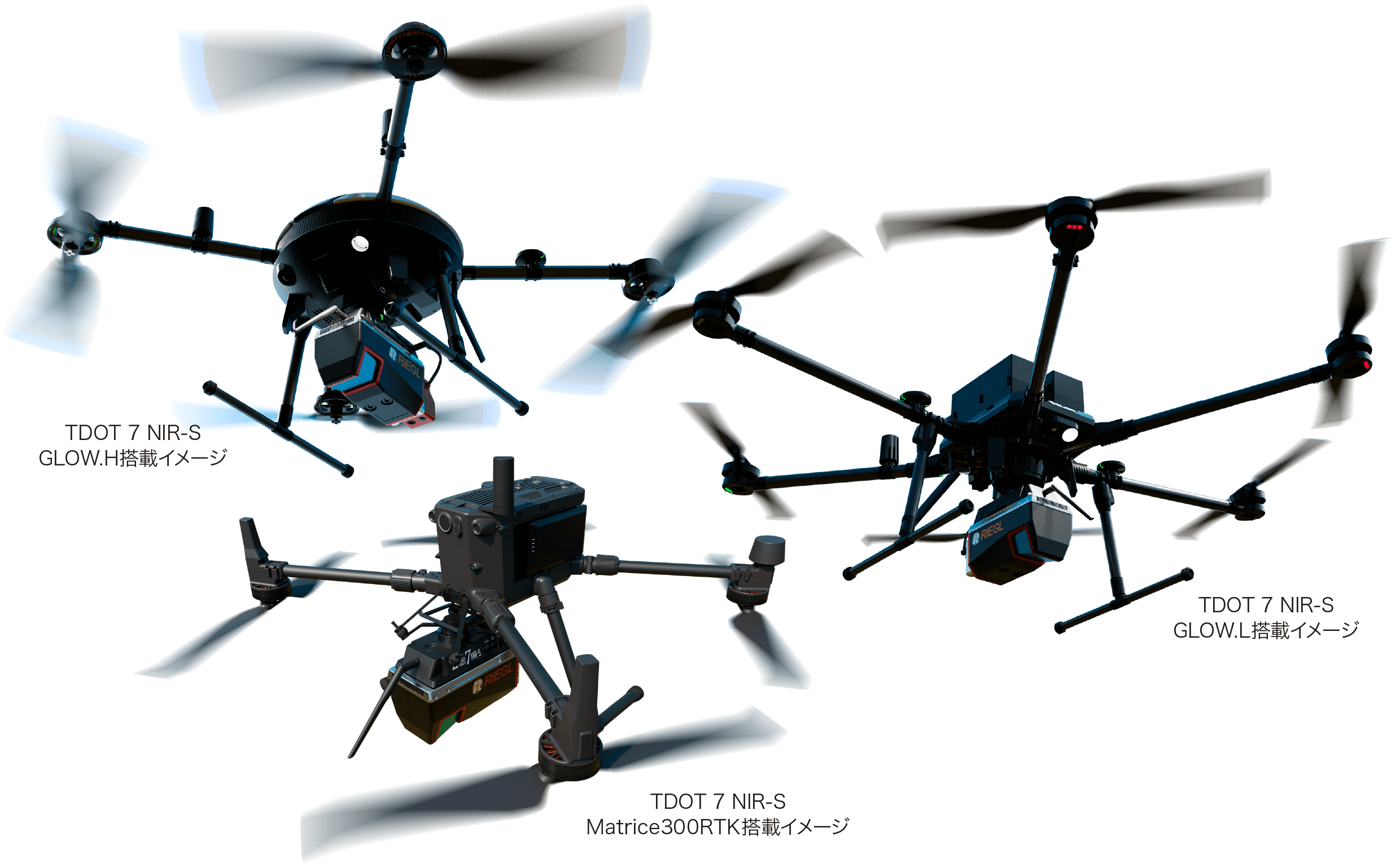 TDOT 7 NIRシリーズは、弊社開発の長時間飛行可能なハイブリッドドローン「GLOW.H」、ポータビリティに優れた産業ドローン「GLOW.L」および、DJI社製汎用ドローン「Matrice300RTK」へ搭載可能です。