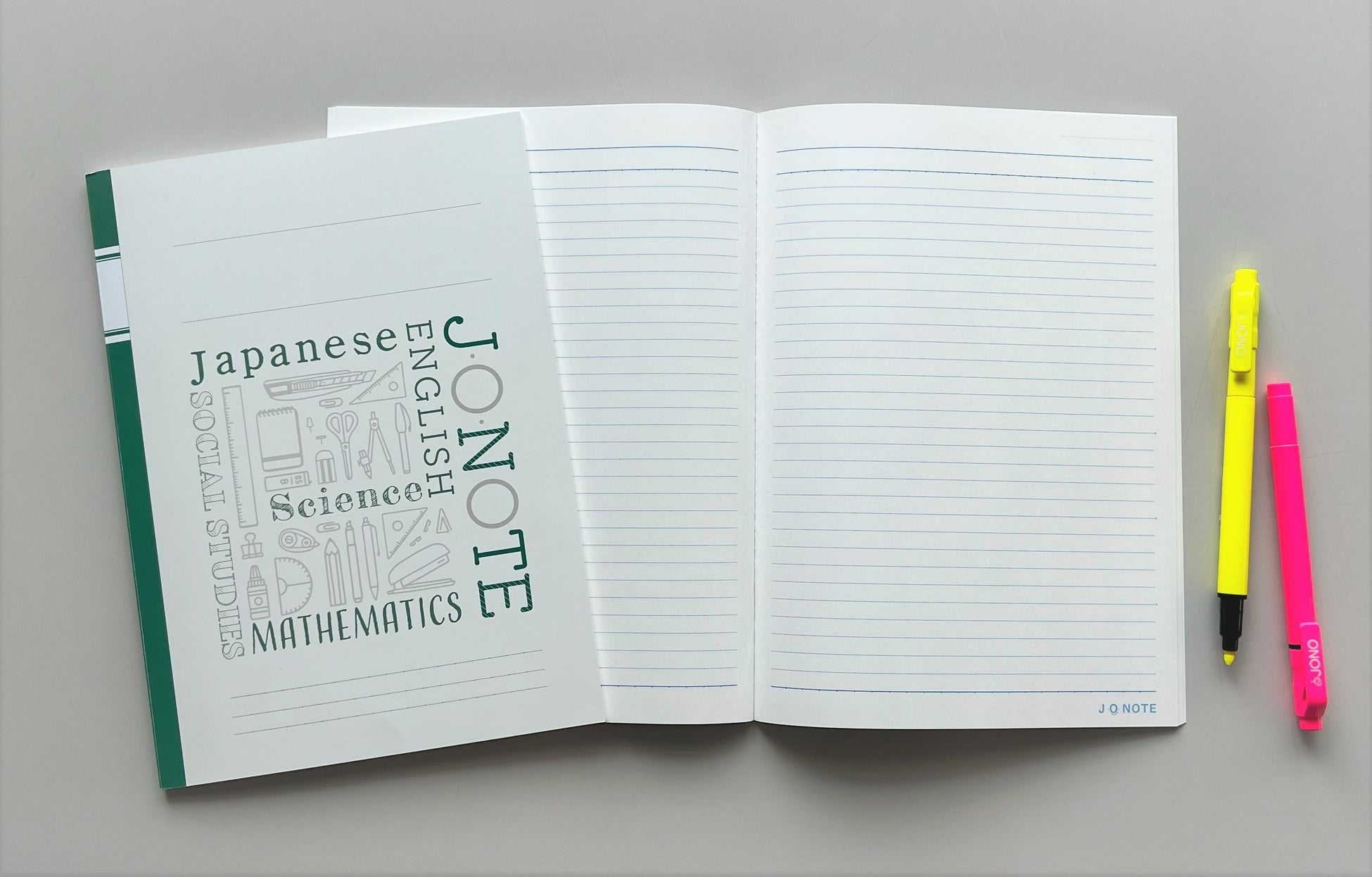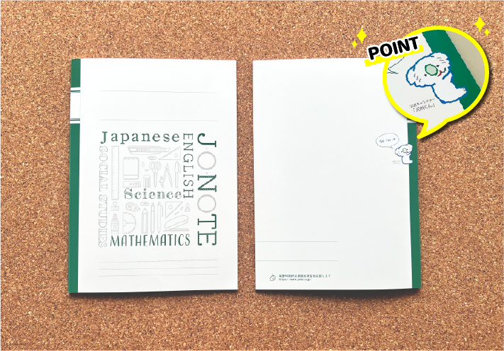 「J・O・NOTE」は、学生が机上でノートを開いた時にフラットになり、めくったときに紙が前に戻らないようなアイデアを取り入れており、今回は表紙の配色“グリーン”に着目しています。人間が一番弱く感じる波長の中間地点(555nm前後)で目に受ける刺激が少なく「目に優しい」と言われるグリーンを基調としたデザインで、学習に集中して取り組める環境づくりを図っています。