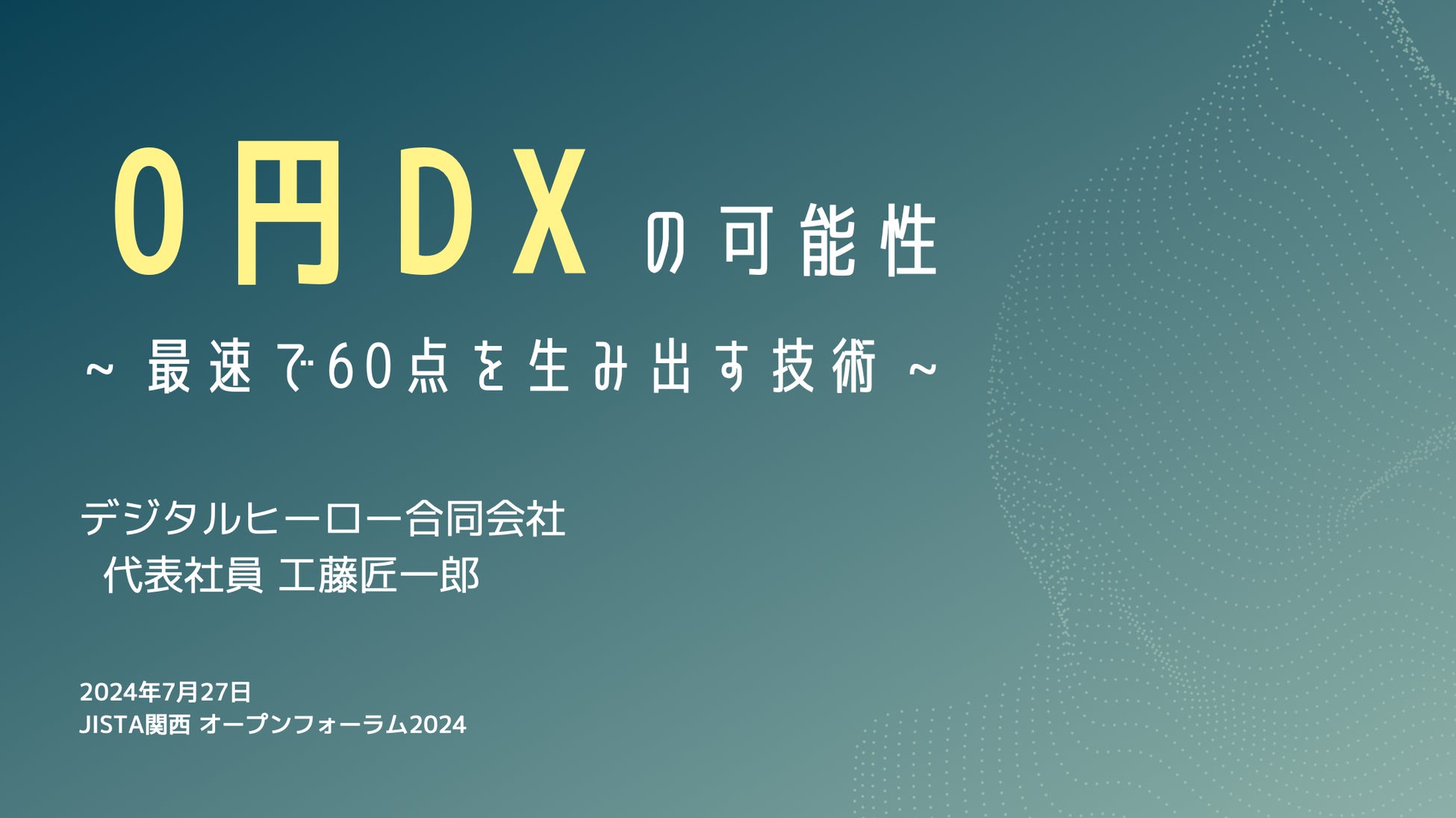 この度デジタルヒーロー合同会社は、国家資格であるITストラテジストを有す人の集う団体、JISTA関西にて、0円DXの可能性をお伝えするセミナーの登壇の機会をいただきました。