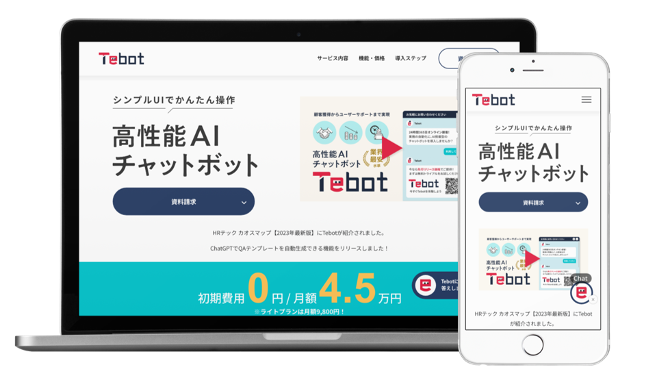 Tebotは、業界最安水準の料金プランで提供されている、問合せ対応業務自動化AIチャットボットサービスです。