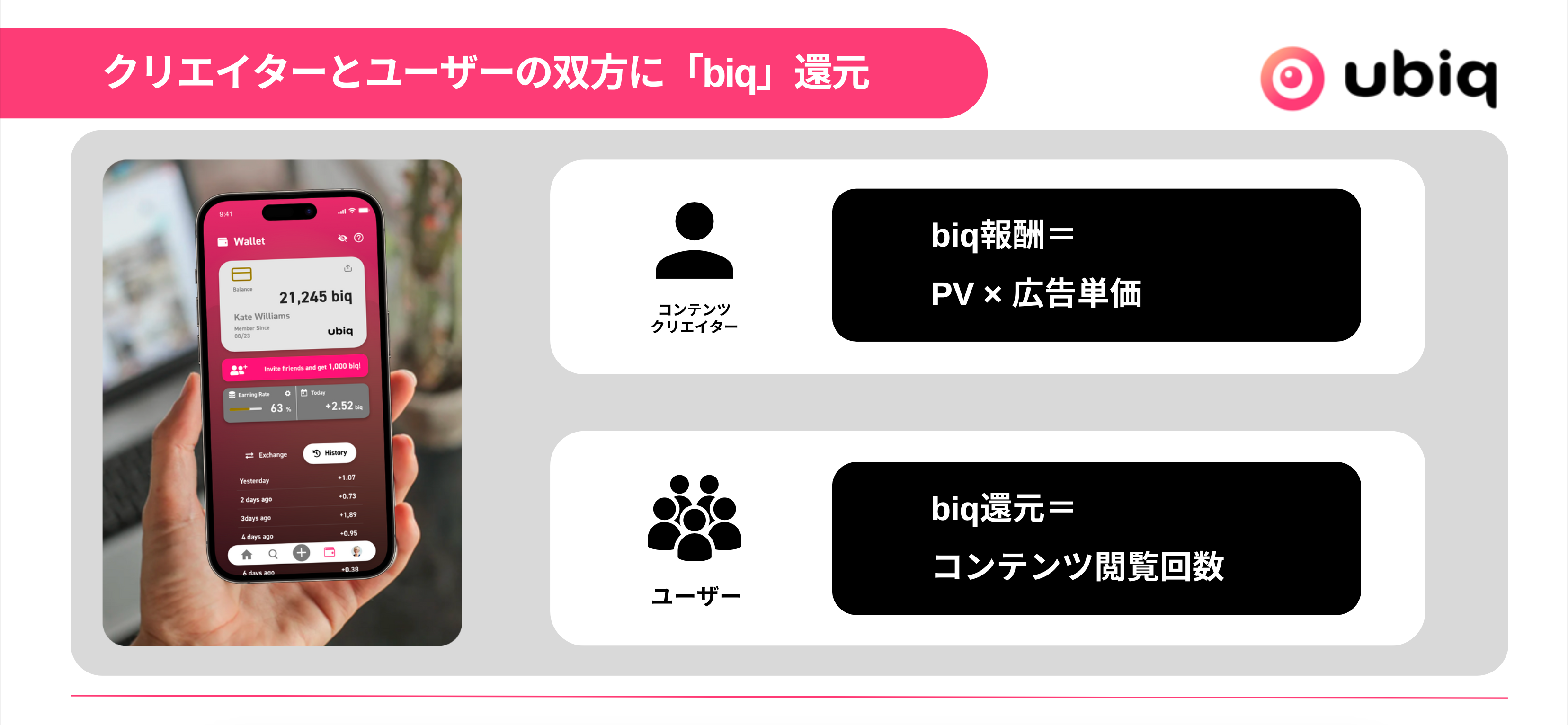 Ubiqのクリエイターには、ご自身の投稿が閲覧された回数に応じてサービス内通貨「biq」が付与されます。