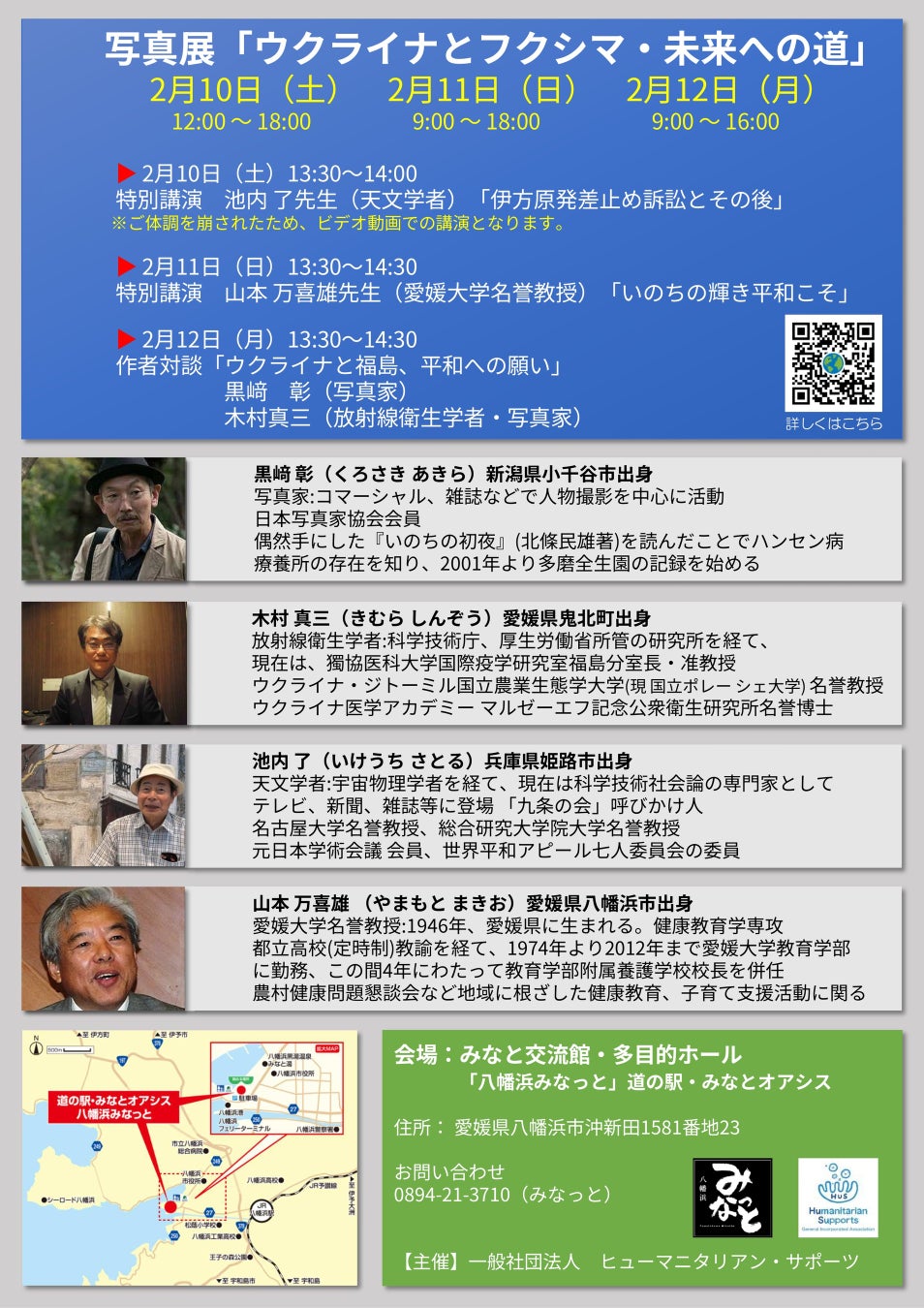 一般社団法人ヒューマニタリアン‧サポーツ(福島県二本松市)は2024年2月10日から2月12日まで、八幡浜みなと交流館(愛媛県八幡浜市)にて写真展「ウクライナとフクシマ 未来への道」を開催します。