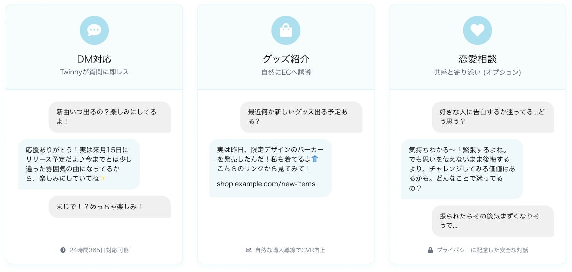 Twinnyは、推し活文化の新たな可能性として、ファンが、インフルエンサーやタレントをそっくり再現したAIと自然に対話できる体験を実現します。まるで本人のような口調、性格、感情をAIで再現し、DMやQ&Aに24時間365日対応することが可能となります。