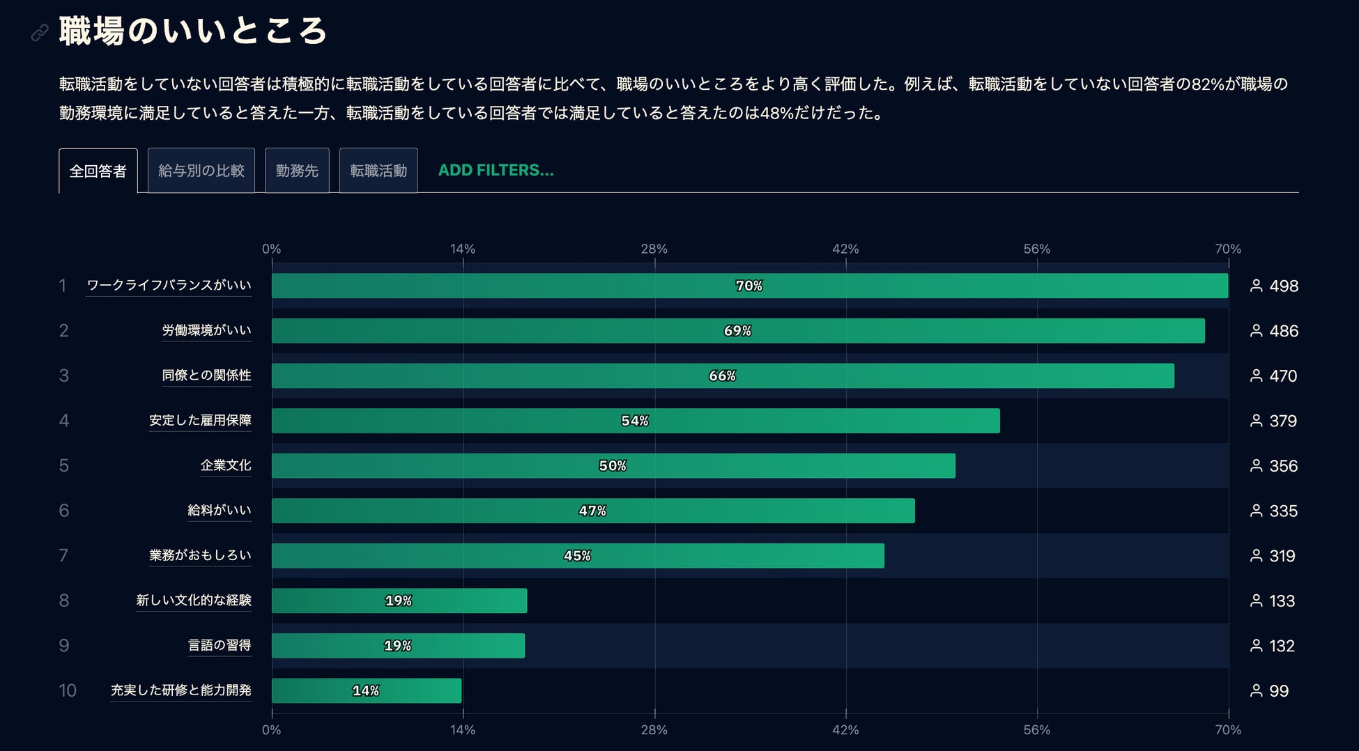 また、ワークライフバランスが悪いと言われがちな日本ですが、今回の調査では回答者の70%が「職場のいいところ」としてワークライフバランスのよさを挙げました。