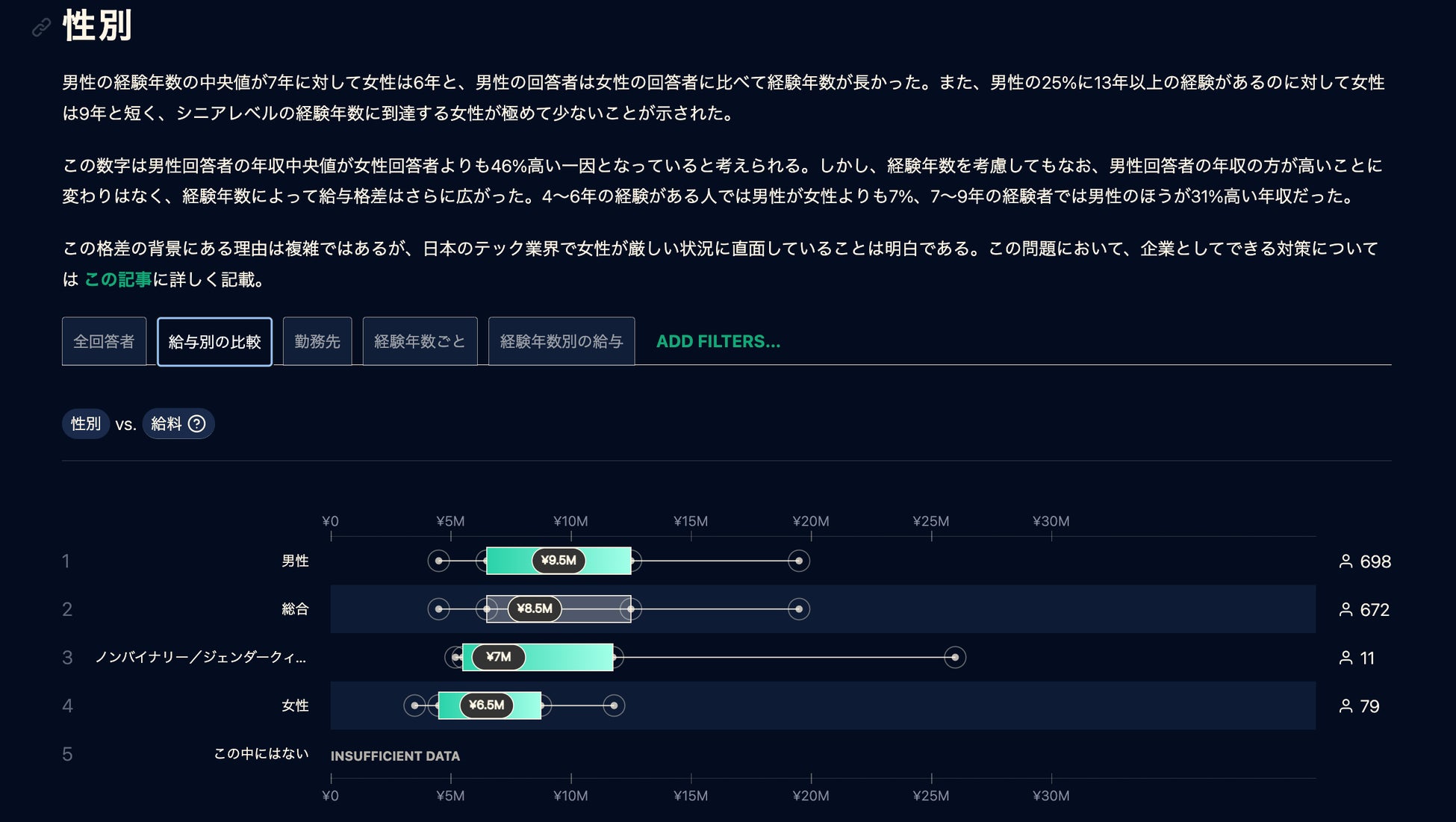 この経験年数の差は、男性エンジニアの年収中央値のほうが女性よりも46%高くなっている一因と考えられます。しかし、同じ経験年数で比較してもなお、男性エンジニアの年収のほうが高いことに変わりはなく、経験年数に比例して給与格差が広がることも示されました。