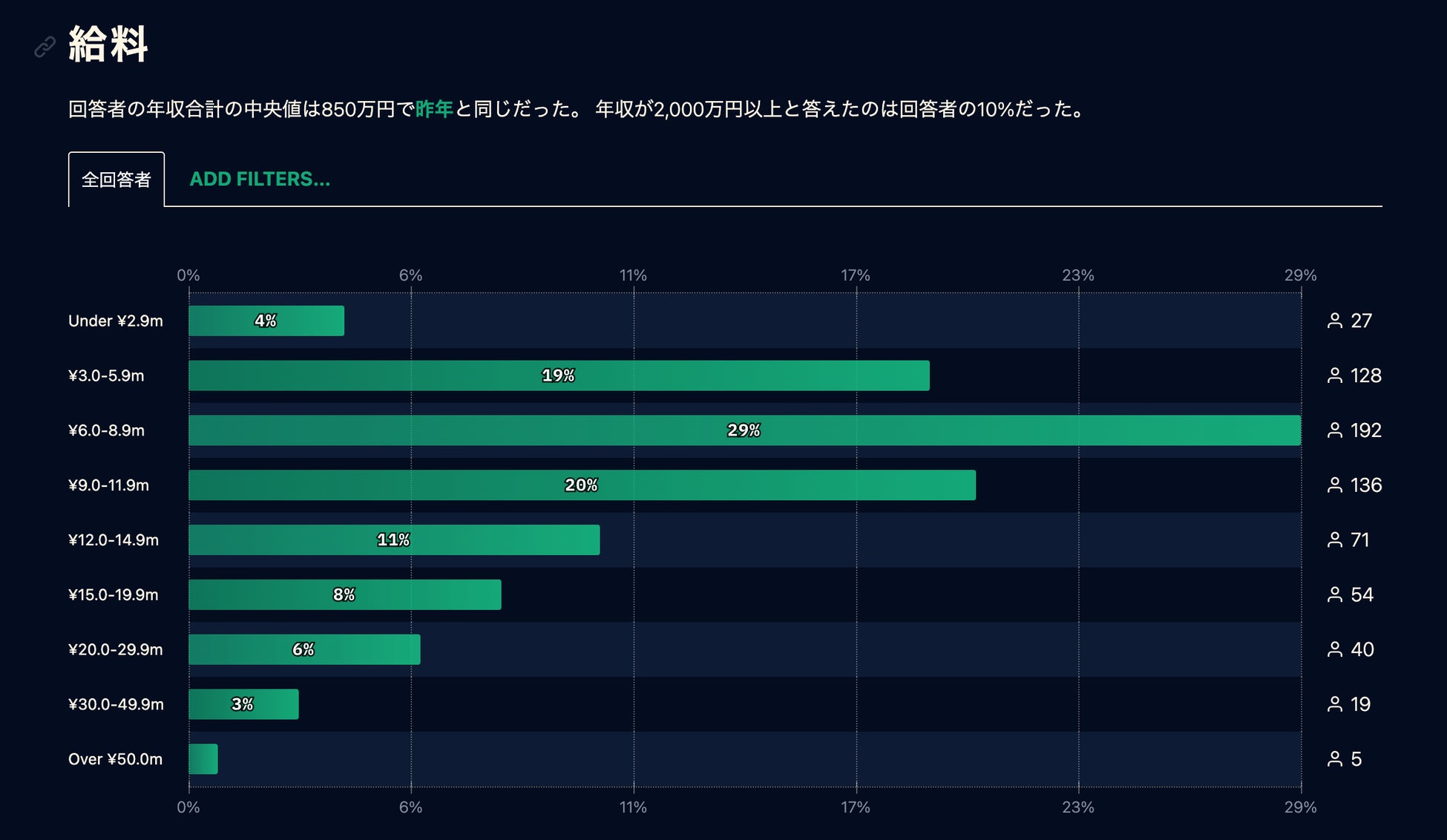 回答者の年収中央値は850万円で昨年から横ばい。年収が2,000万円以上と答えたのは回答者の10%でした。