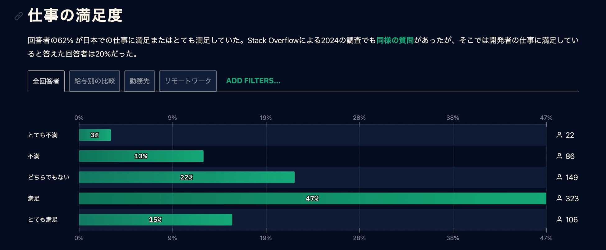 詳細はhttps://2024.surveys.tokyodev.com/ja-JP/ でご覧いただけるほか、各データをご自身の関心に合わせてカスタマイズして分析していただくこともできます。