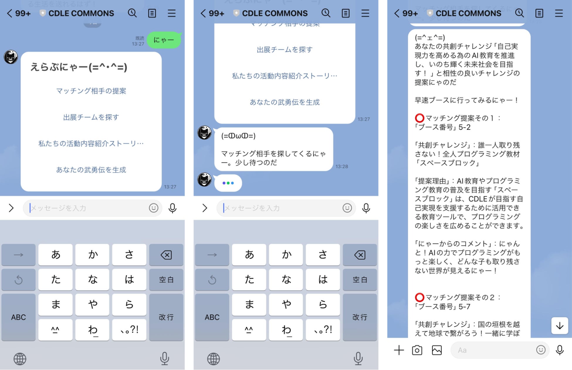 その中で、当社が参画するAIマッチングブースでは、会場内で出展している共創チャレンジ・共創パートナー同士のマッチングを促すべく、前述のLINEボットをチューニングし、当日専用の「共創マッチングAI」としてその場で体験いただけるようにしました。