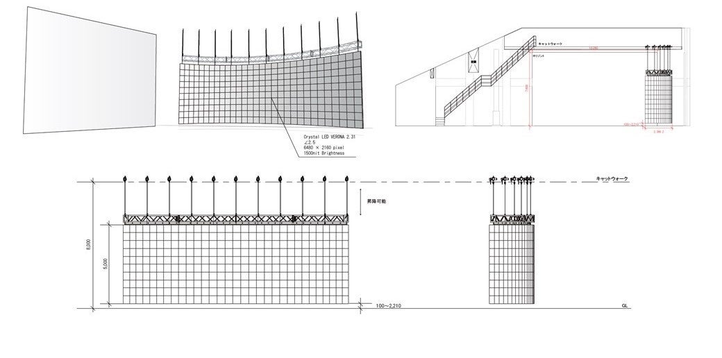 幅15.0m×高さ5.0mの高精細なソニー製Crystal LED VERONAを電動ウインチで制御し、約2.2mの範囲で昇降させる事が可能です。これによりアングルやセットの高さの制限が解消され、より自由な画作りが可能になります。