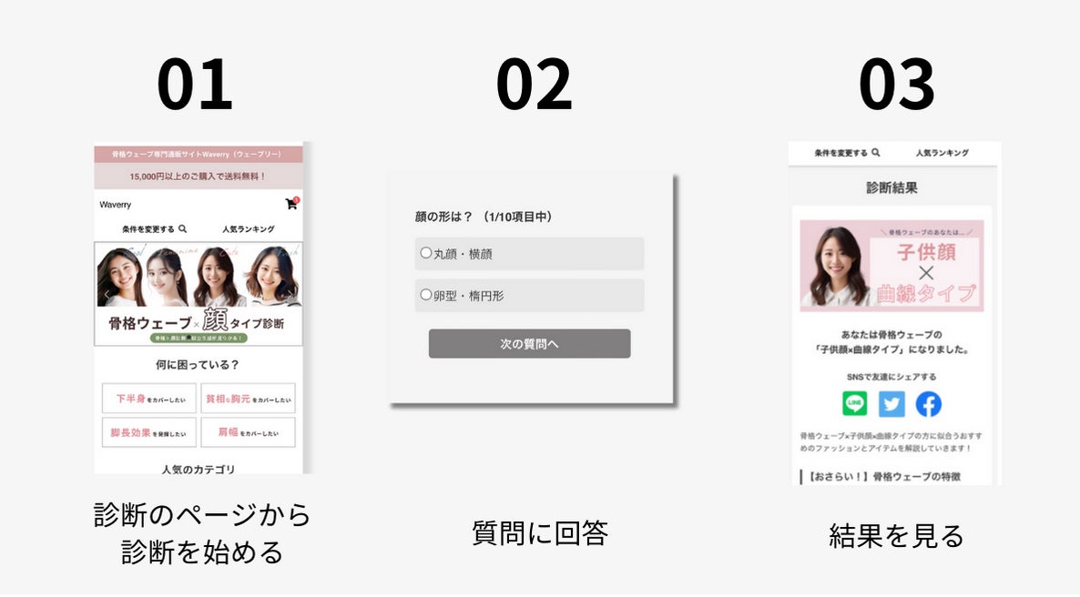 ユーザーは、スマートフォンからWaverryの「骨格ウェーブ×顔タイプ診断」の診断ページ(https://www.waverry.jp/diagnosis) にアクセスします。 その後、画面の案内に従って「顔のパーツの特徴」といった全11個の質問に回答をします。