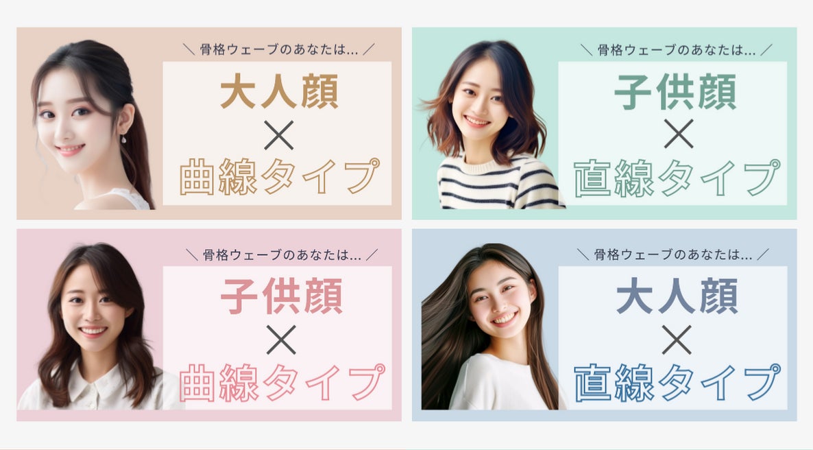 顔タイプの診断は、「大人顔or子供顔」「顔のパーツが曲線or直線」の4項目の組み合わせによって決定します。