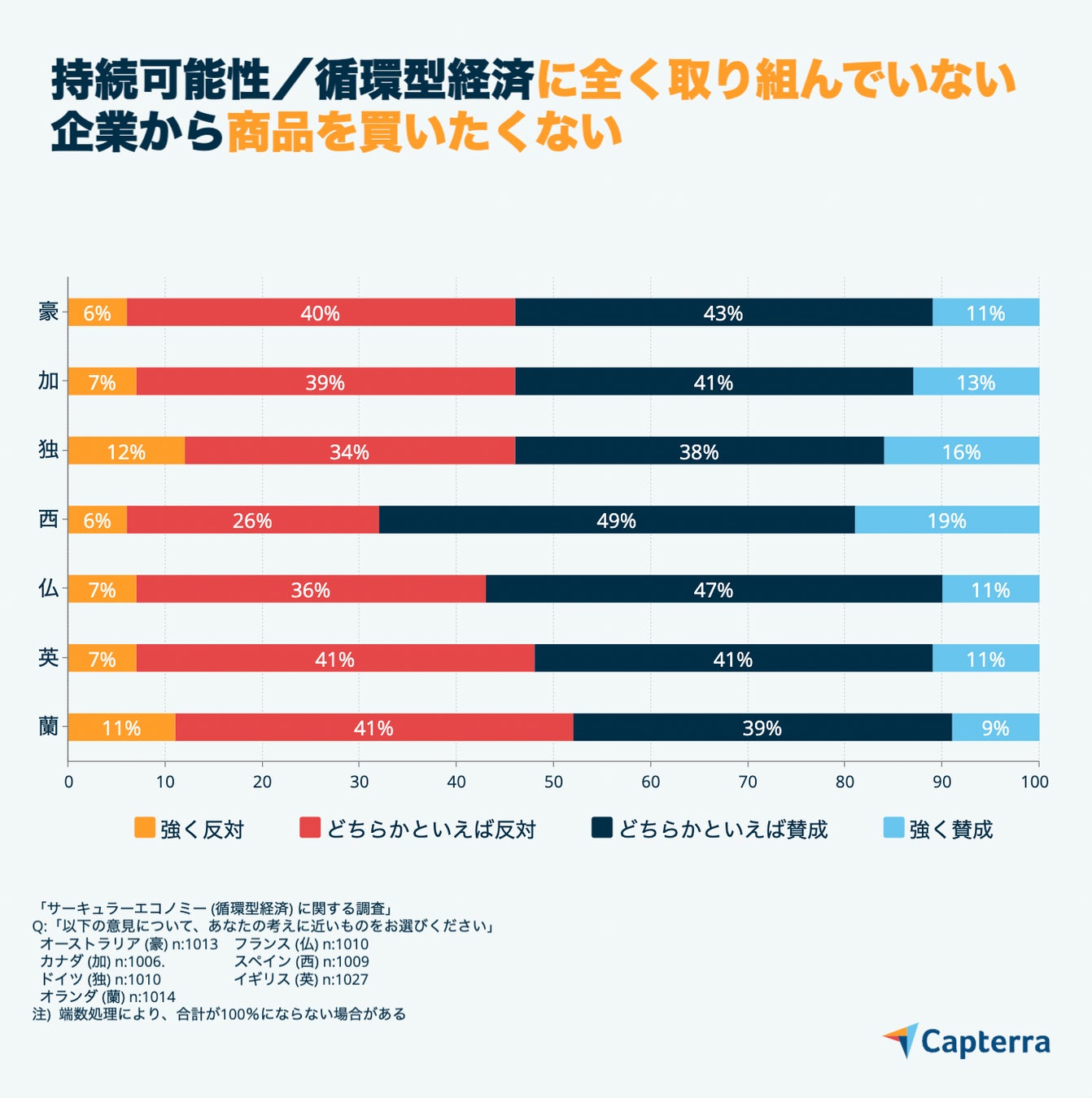 弊社がヨーロッパを中心に7カ国 (オーストラリア、カナダ、ドイツ、スペイン、フランス、英国、オランダ) を対象に実施した「サーキュラーエコノミー (循環型経済) に関する調査」では、オランダを除く全ての国で、SDGを取り入れていない企業からの購入をやめると答えた消費者がなんと大半を占めたことが明らかになりました。
