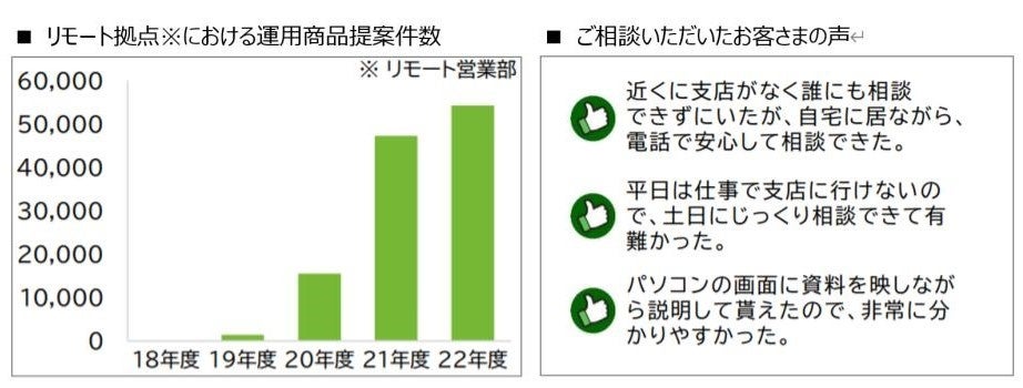 三井住友銀行では、2014年4月より、個人のお客さま向けにリモート営業第一部(所在地:東京都)、リモート営業第二部(所在地:兵庫県)を設置し、電話やオンライン面談で個人のお客さまからの資産運用に関するご相談を承ってまいりました。