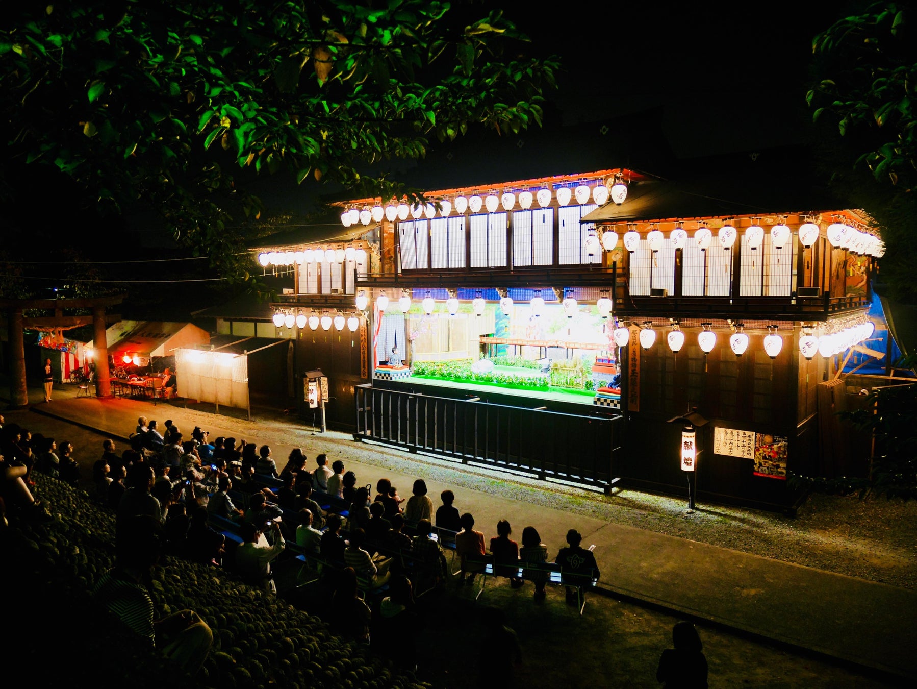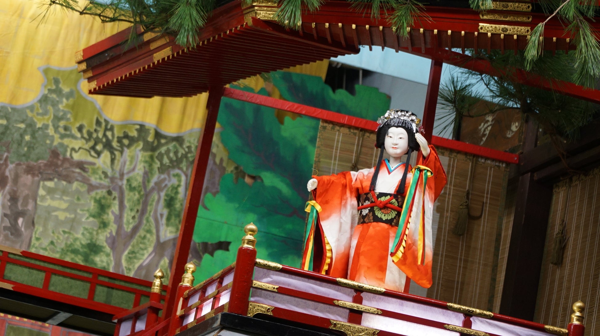 山鹿の大宮神社から奉納燈籠をもらい受け、江戸時代半ばに福島町民が独自の工夫をして人形の燈籠を奉納したのが始まりだといわれています。そのころ大阪方面で流行っていた人形浄瑠璃の技術を取り入れて現在の形になりました。3層2階建の釘や鎹を1本も使用しない屋台が、期間中だけ組み立てられ、囃子にあわせてからくり人形芝居が上演されます。