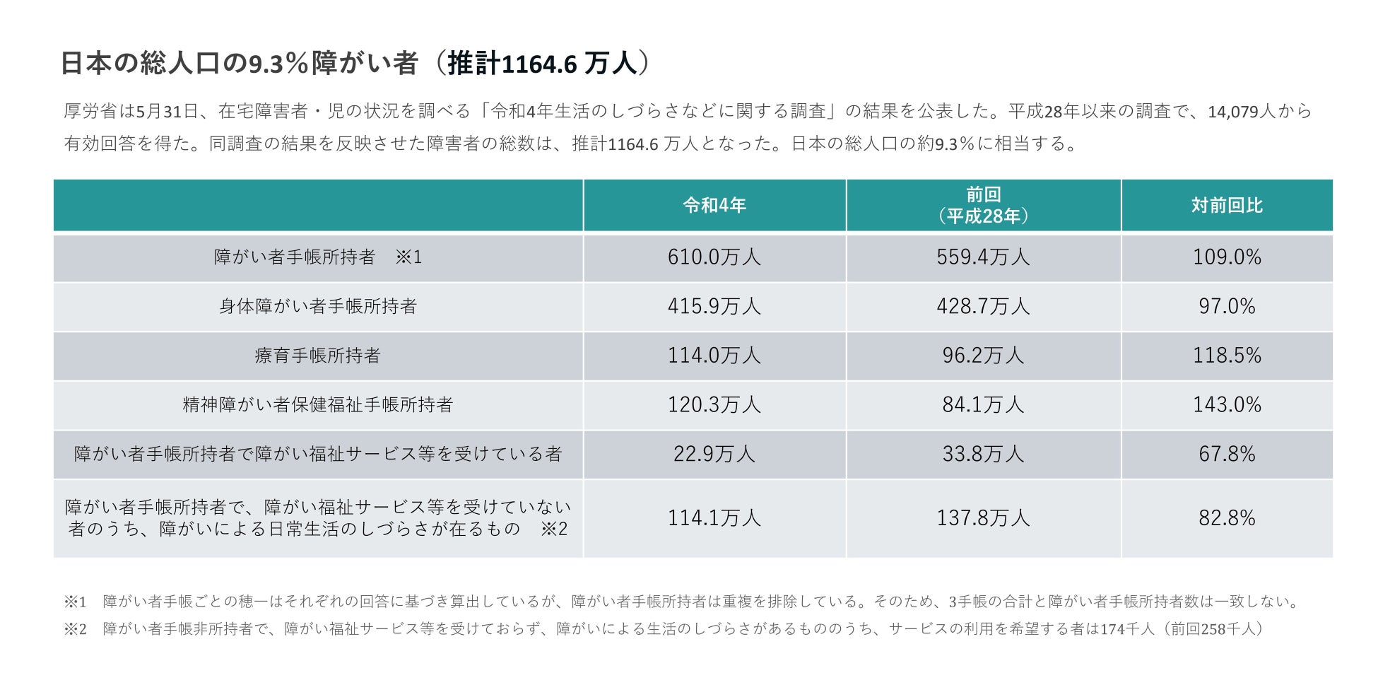厚生労働省の発表によれば、日本国内で障がい者手帳を保有する方は1,000万人を超え、その中には、就労継続支援事業所などを通じて社会参加を希望する人も多数含まれています。
