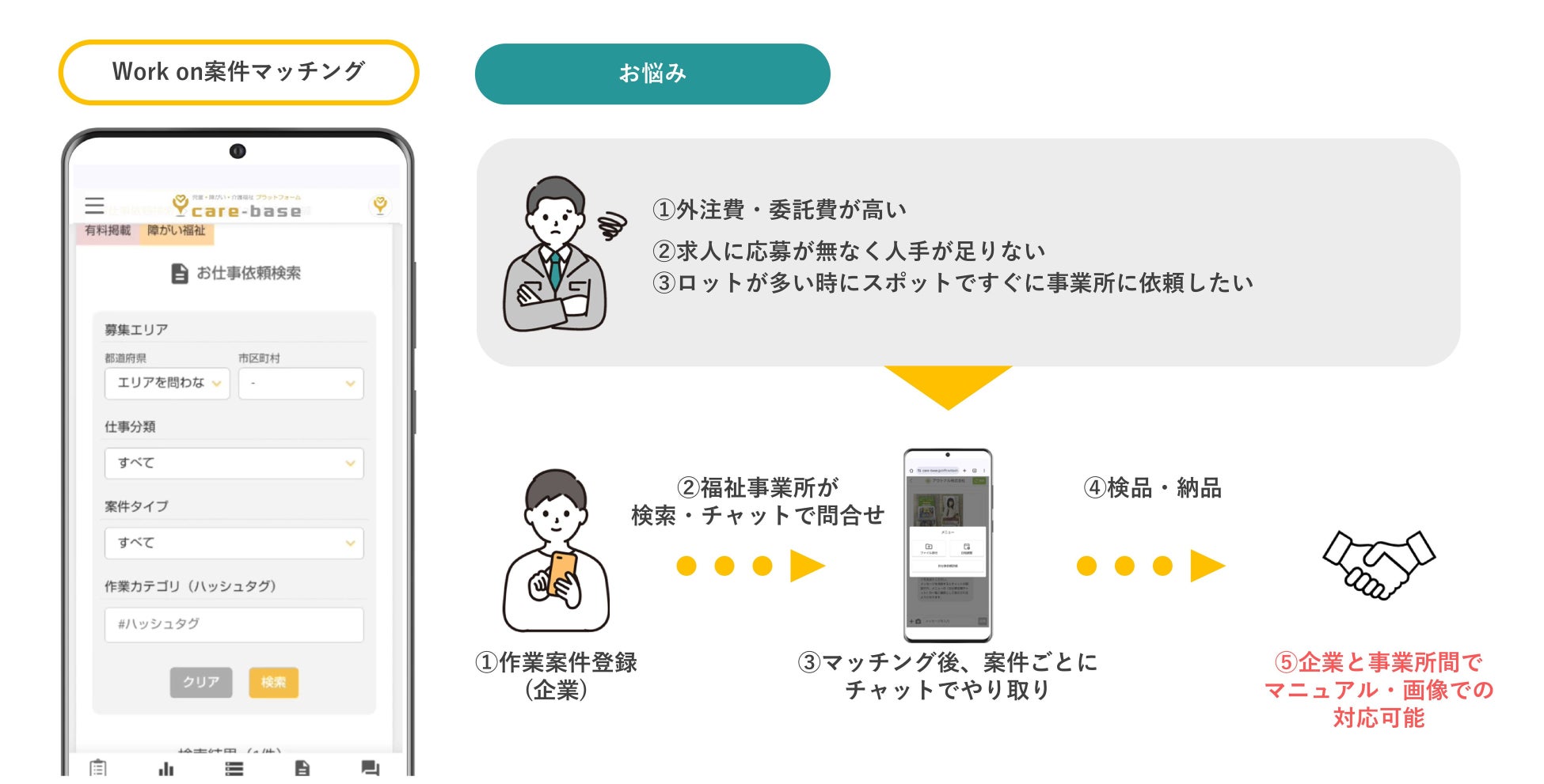 「Workon」は、企業・店舗・生産者の方などが抱える“ちょっとした仕事”を、地域の福祉事業所へ依頼できるマッチング機能です。