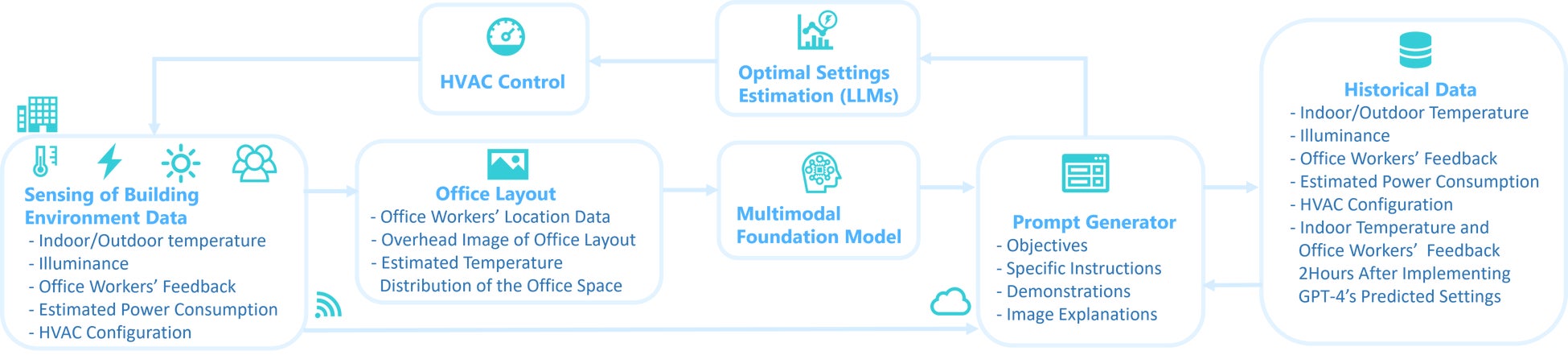 これらのデータと過去の環境データ、フィードバック情報は、生成AIモデルのプロンプトとして使用され、現在および過去の環境条件と人間の快適性フィードバックを考慮した、1日の各時間帯における最適なHVAC設定温度を予測しました。