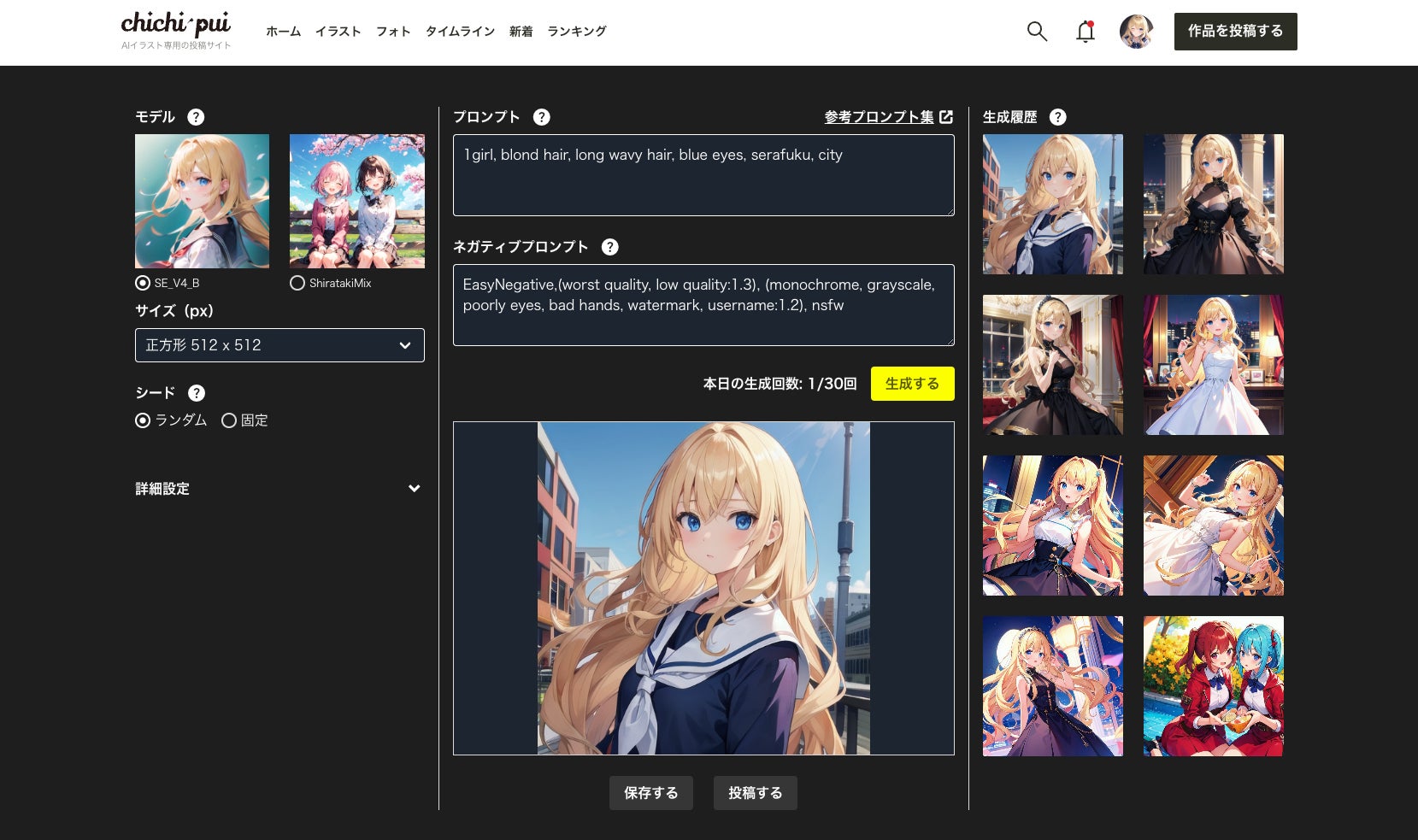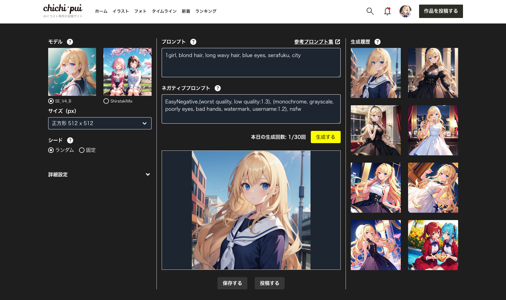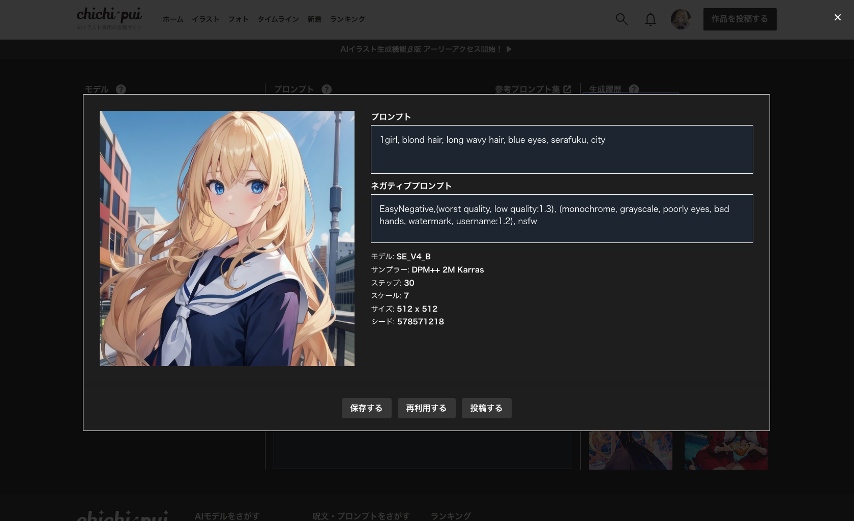 生成したイラストは生成履歴から簡単にchichi-puiサイトに投稿できます。