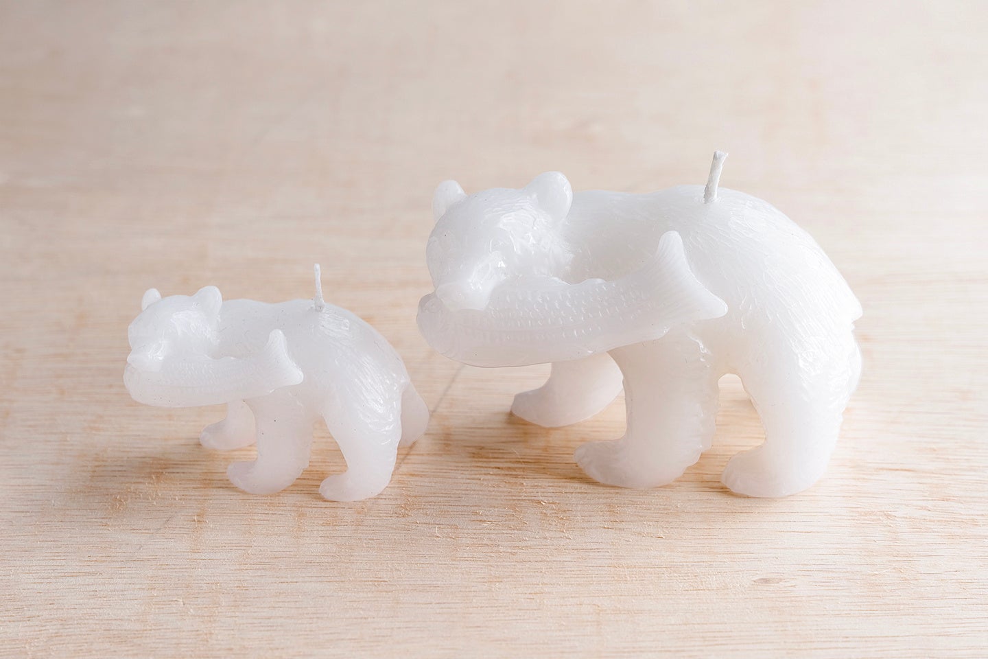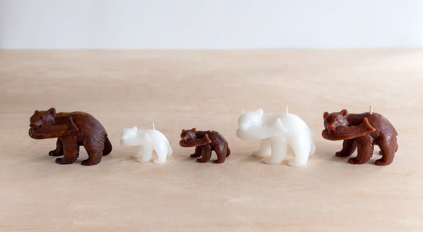 再販にあたり、これまでの親熊サイズに加え「子熊サイズ」が新登場。また色も「白」に加え「茶」が新登場。白熊と茶熊が揃いました。木彫り熊好きにも、キャンドル好きにも、雑貨好きの皆様の心もきっとくすぐります。