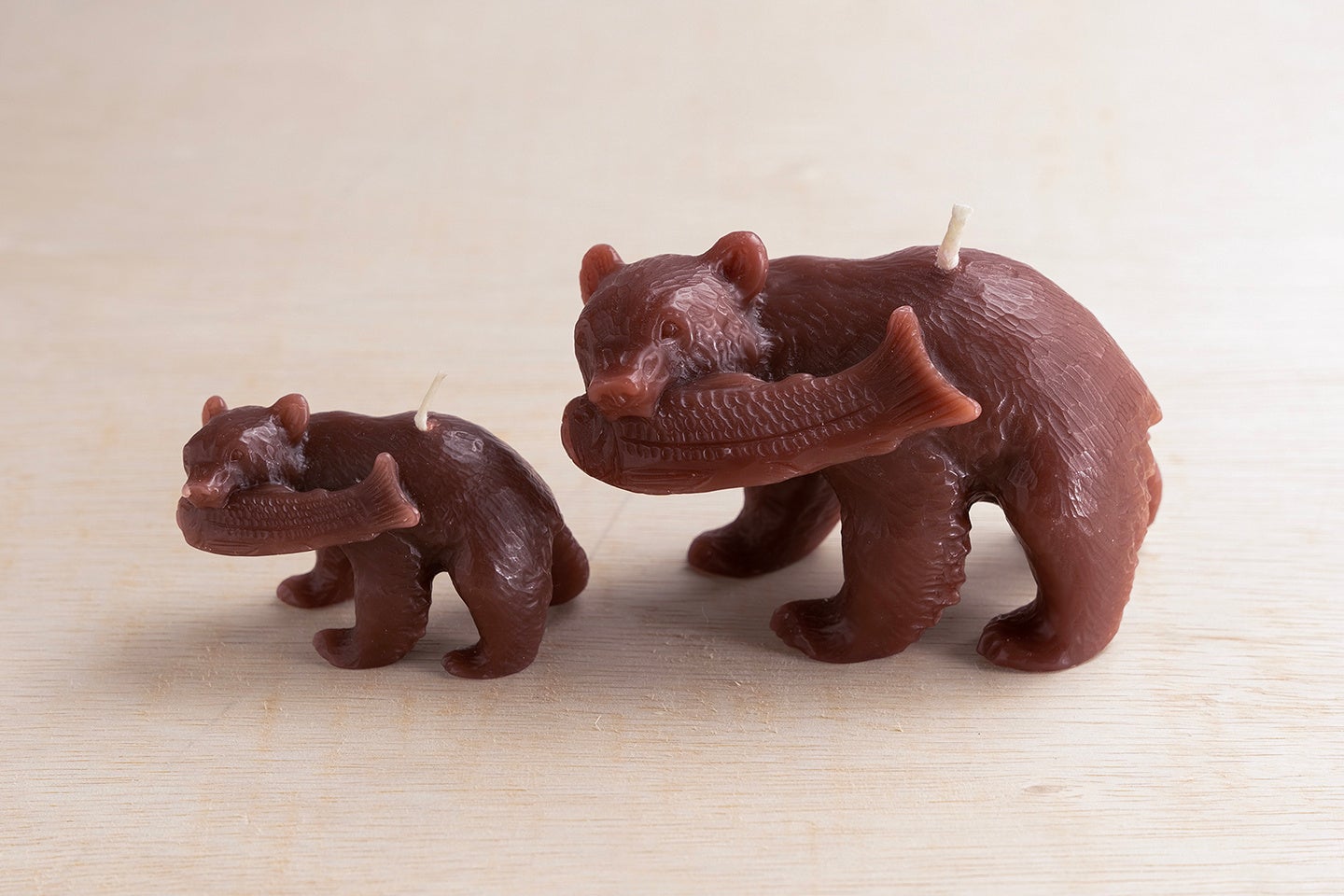 初代「木彫り熊キャンドル」発売から7年。待望のリニューアル再販が叶いました。木彫り型は札幌在住木彫り師・堀井清美さんによるもの。繊細に表現された熊の毛並みや瞳、鮭の鱗や顔つきも是非愛でてほしいアートキャンドル。