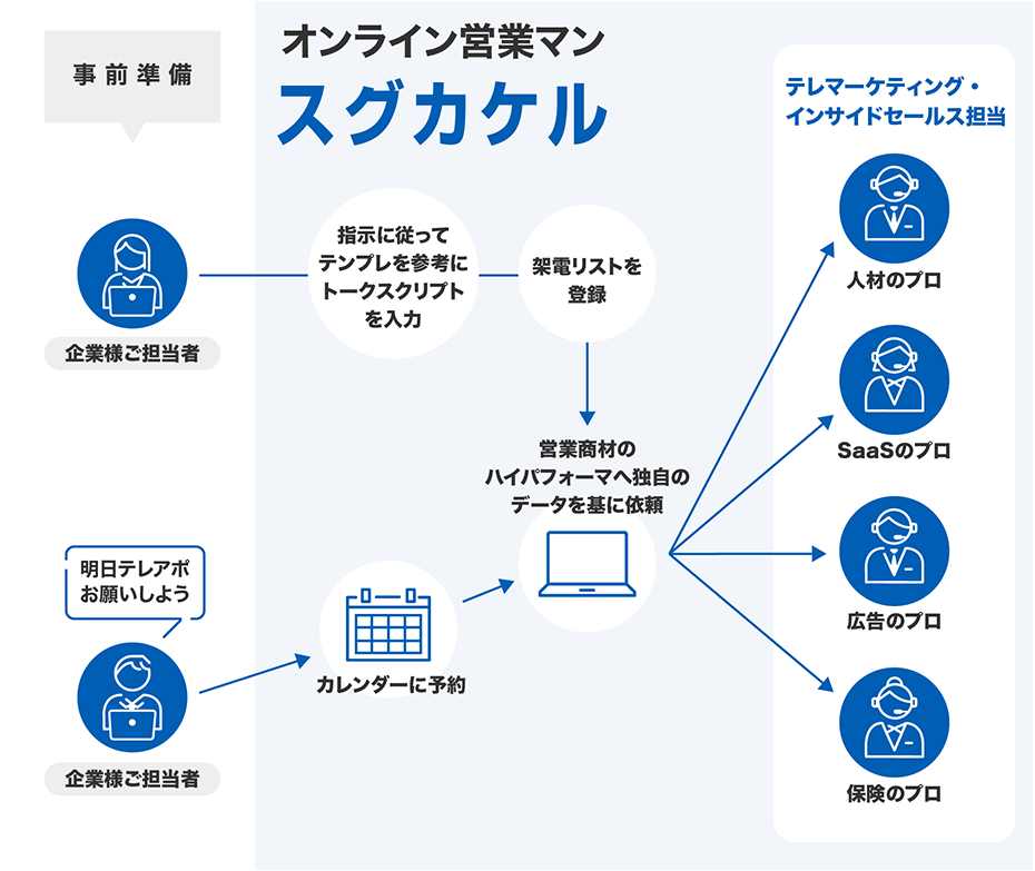 「スグカケル」では、このような問題を解決するために、実務経験豊富な⼈材が、弊社独自のカスタマーセールスという新しいアプローチを元にアポイント獲得を行い、企業様の事業成長に貢献します。