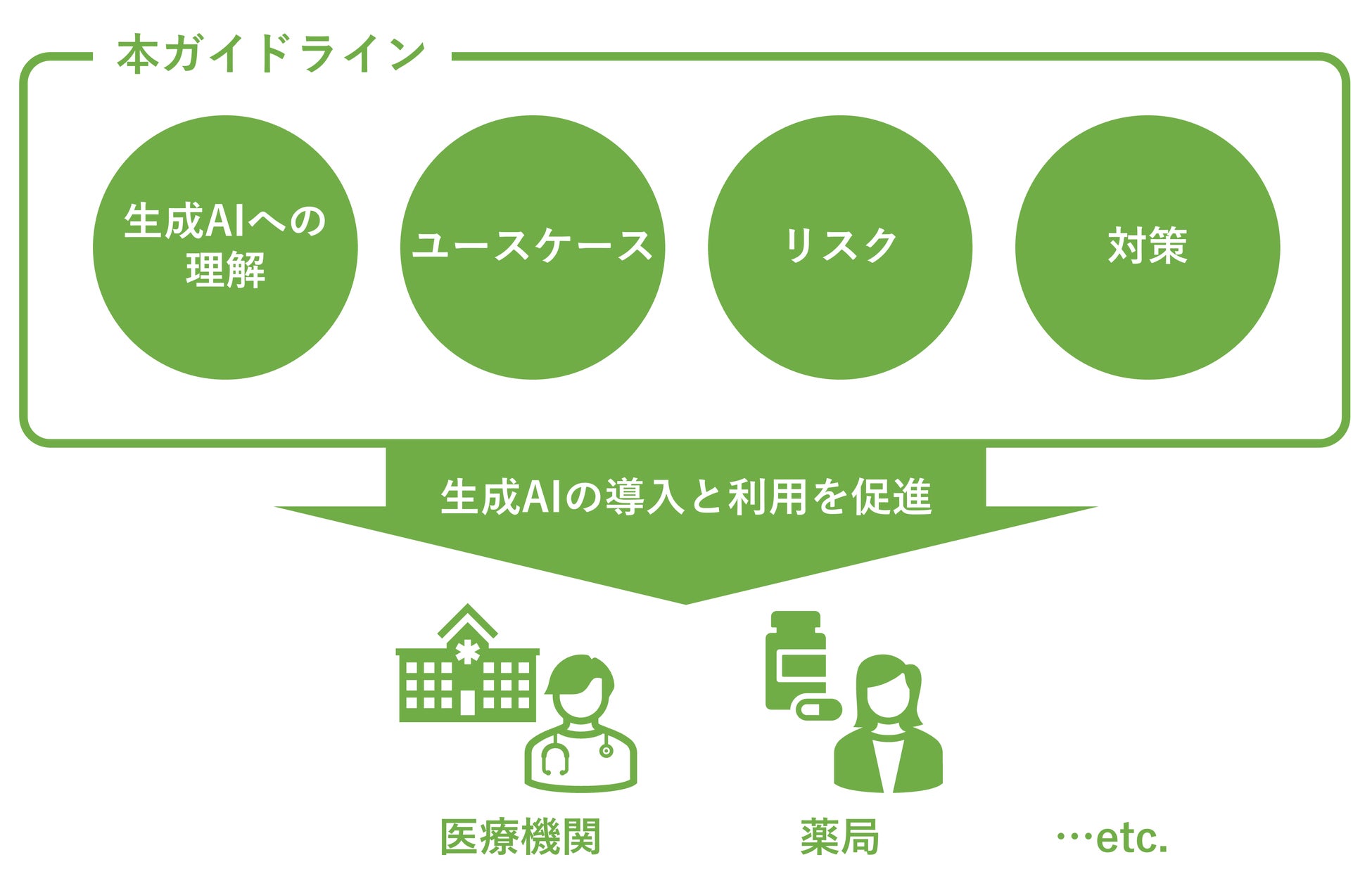 本ガイドラインは、生成AIを医療機関・薬局等で利用する方、もしくは開発に携わる方が注意すべきポイントを理解し、医療現場での生成AIの導入と利用を促進することを目的に策定しています。