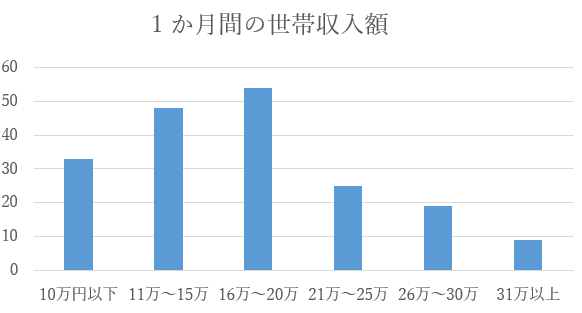 また、正規雇用であっても収入が低い世帯が多く、1 か月間の世帯収入額は、20万未満の世帯が全体の7割を占めました。調査対象世帯のうち半数以上が母子家庭であることも関連していると考えられます。