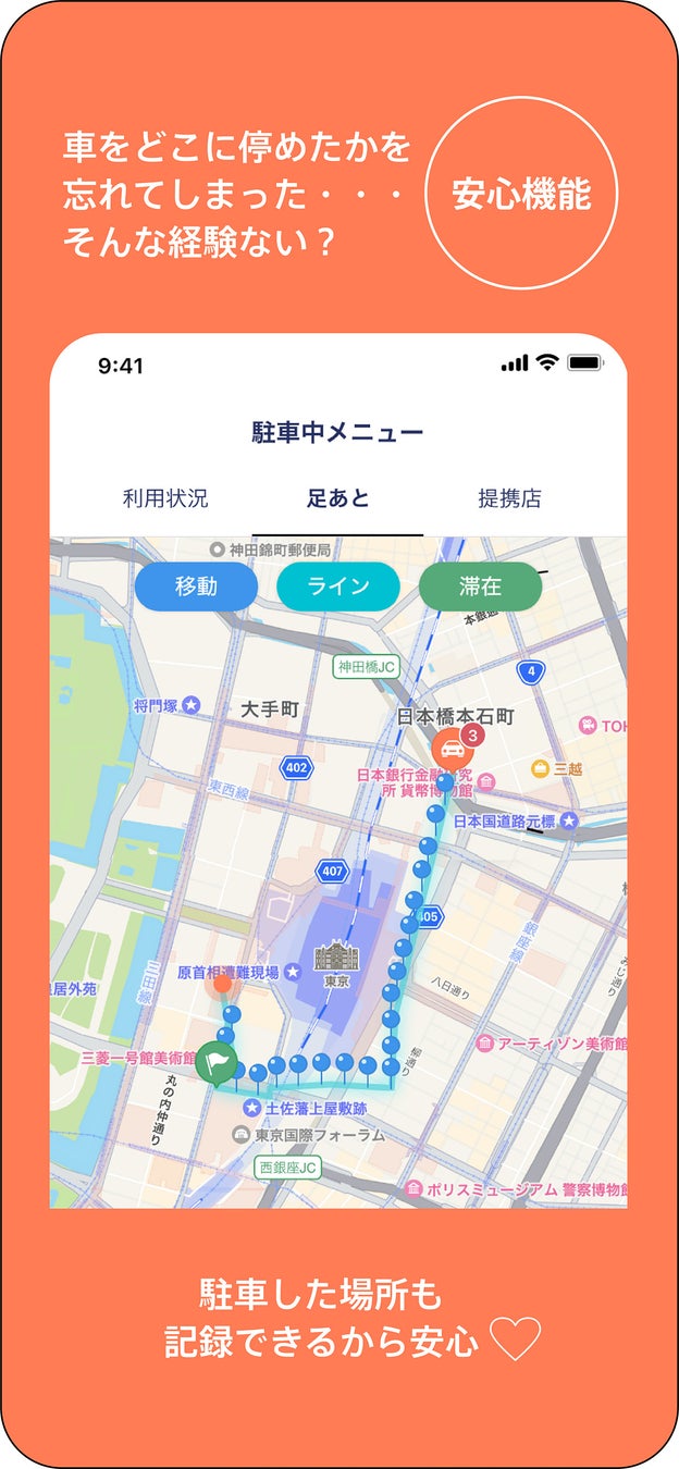 土地勘のない場所など、どこに停めたか忘れてしまうことも。。。駐車記録機能がついているので安心です。