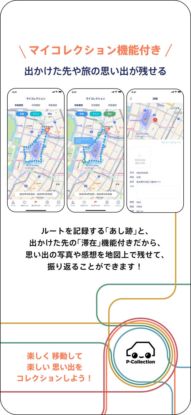 出かけた先や旅の思い出を地図上に残し、振り返ることができます。ビジネスシーンにおいてニーズのある駐車履歴一覧のCSVダウンロード機能もあります。