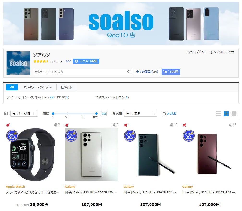 Qoo10店(中古スマートフォン販売): https://www.qoo10.jp/shop/soalso