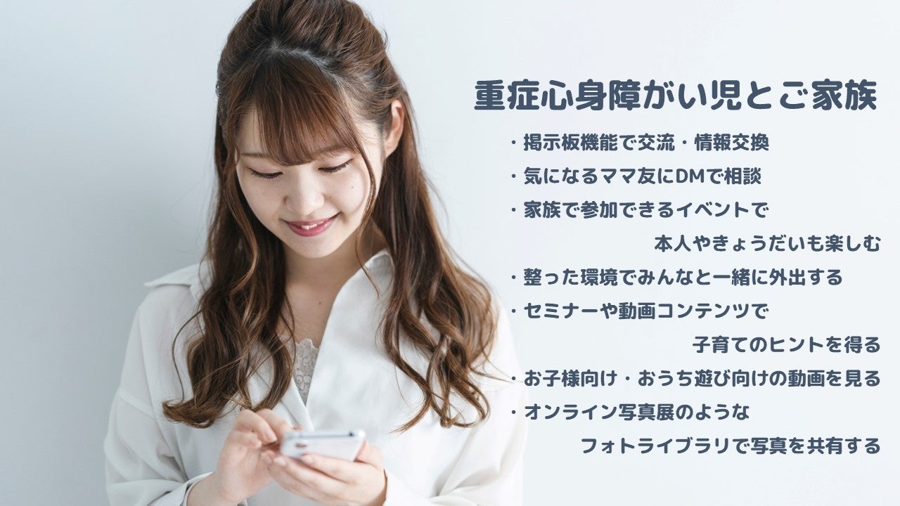 個別性の高い重症児の子育てをママ友・パパ友に相談できる掲示板、子育てや支援に役立つセミナーや動画コンテンツ、子ども向け・大人向けのイベントなど、重症心身障がい児に関わるすべての人に役立つコミュニティへ