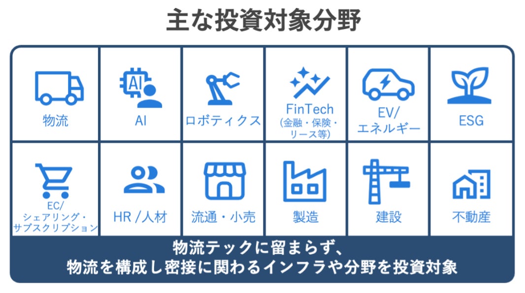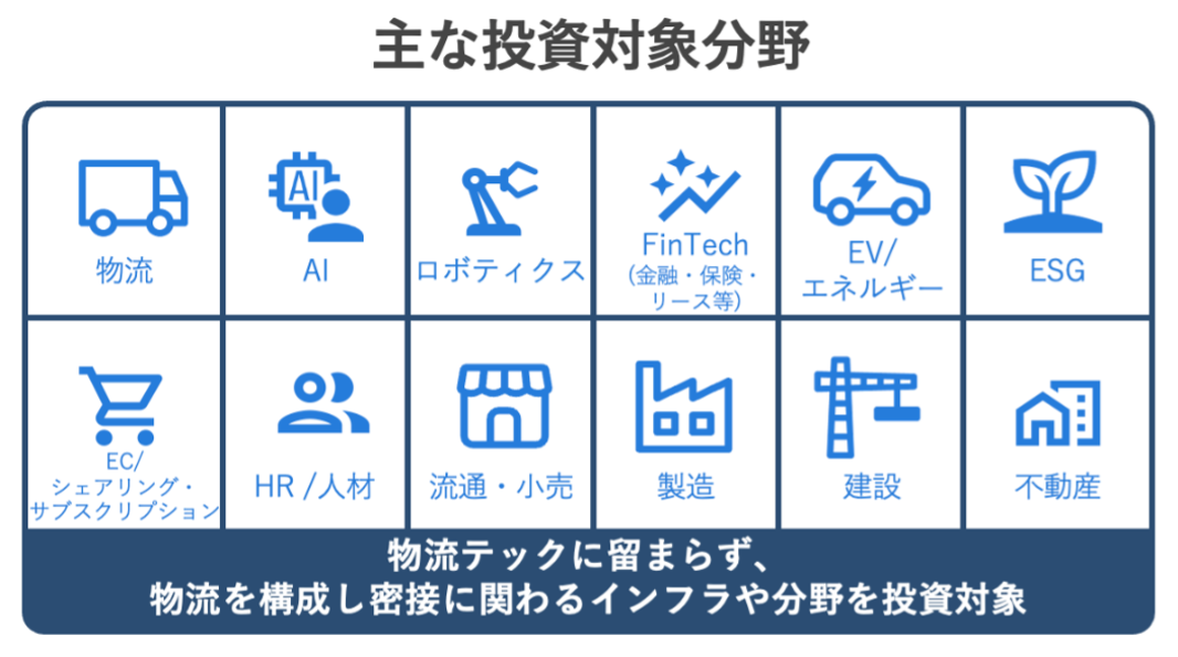 主な投資対象:物流、不動産、ロボティクスやAI/人工知能(いわゆるディープテック)、FinTech、ECなどの物流及び物流を構成し密接に関わるインフラや分野における国内ミドル・レイターステージを中心としたスタートアップ企業