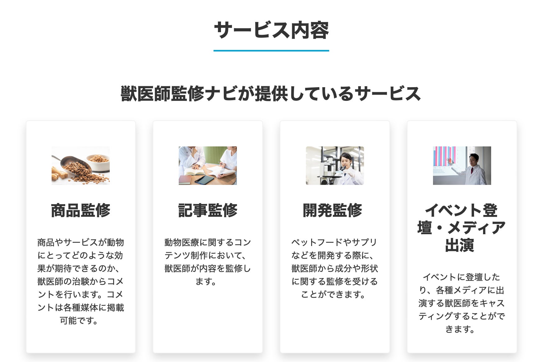 「獣医師監修ナビ」は、「商品やサービスの魅力を飼い主に裏付けを持って伝えたい」「専門家に商品開発や監修をお願いしたい」という企業様と獣医師をマッチングするサービスです。