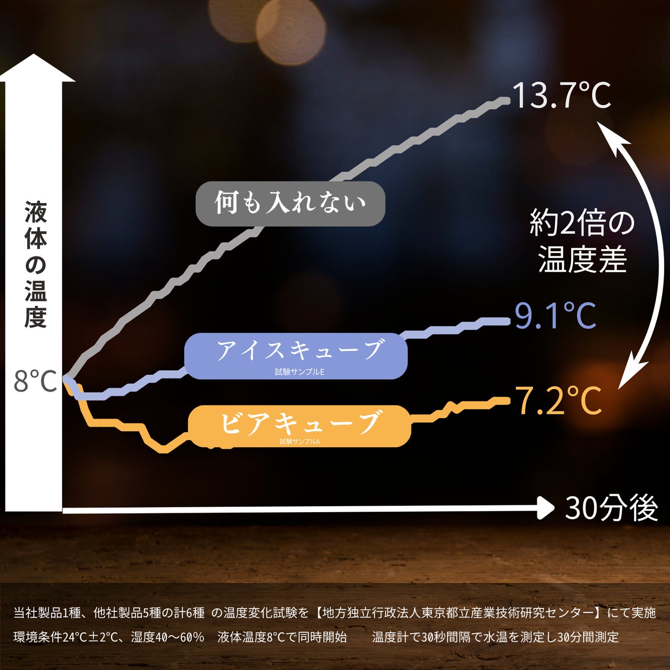 2023年3月、市販されている6種のアイスキューブを各工場から取り寄せて研究し、その中で最も保冷力があり、品質の高い素材(SUS304)を使用している製品をビールに適した『ビアキューブ』というブランド名で発売したアイテムです。