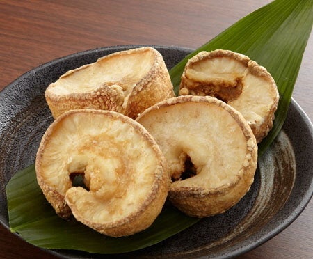 油かすは牛の小腸を油で揚げて余分な脂や水分を飛ばした食品で、表面はカリカリで中はプルプルとした食感があり、コクのある独特のうまみがあります。大阪の南河内地域で昔から食べられており、かすうどん等に使われています。