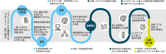「睡眠エコシステム」では、睡眠の重要性を啓発しながら課題を顕在化し、疾患のリスクがある方には受診行動を促すことで医療へのアクセスを確保します。また治療開始後も日常的に症状をモニタリングすることで、個人差の大きい睡眠の状況を可視化し、ひとり一人、その時々に最適な対応が可能となる環境づくりを目指します。