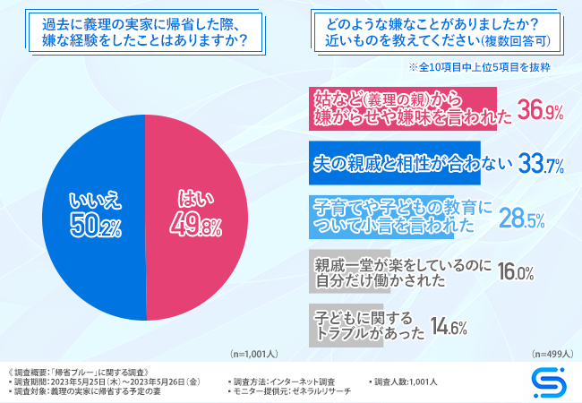 そこで、「過去に義理の実家に帰省した際、嫌な経験をしたことはありますか?」と質問したところ、半数近くの方が『はい(49.9%)』と回答する一方で、半数程度の方は『いいえ(50.2%)』と回答しました。