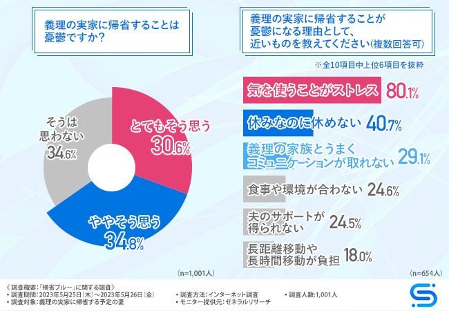 そこで、「義理の実家に帰省することが憂鬱になる理由として、近いものを教えてください(複数回答可)」と質問したところ、『気を使うことがストレス(80.1%)』と回答した方が最も多く、次いで『休みなのに休めない(40.7%)』『義理の家族とうまくコミュニケーションが取れない(29.1%)』『食事や環境が合わない(24.6%)』『夫のサポートが得られない(24.5%)』『長距離移動や長時間移動が負担(18.0%)』『家事の手伝いをさせられる(13.5%)』『プライバシーが守られない(13.5%)』『自分だけ粗末に扱われているように感じる(12.8%)』『その他(4.0%)』と続きました。